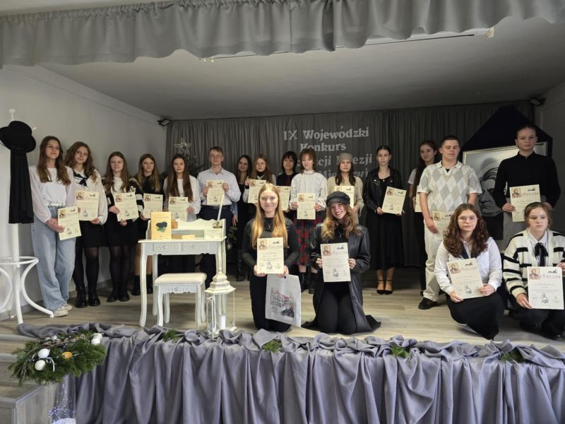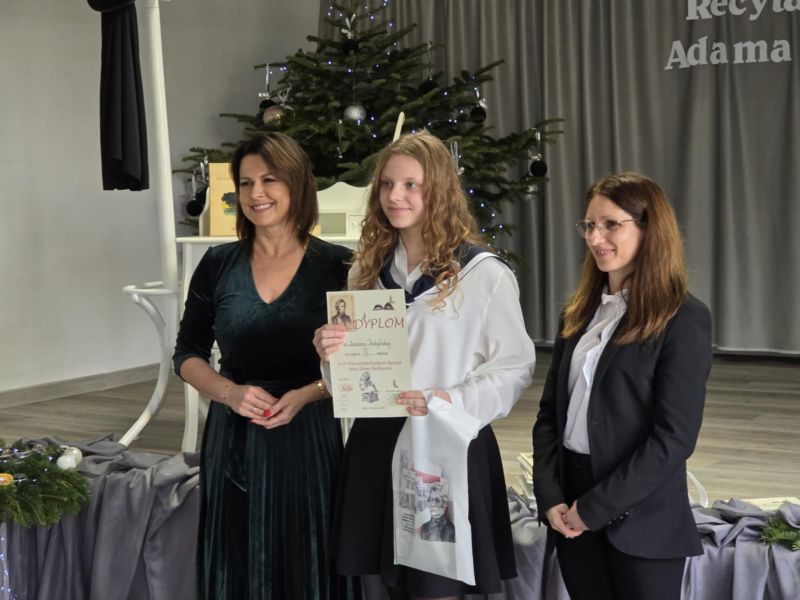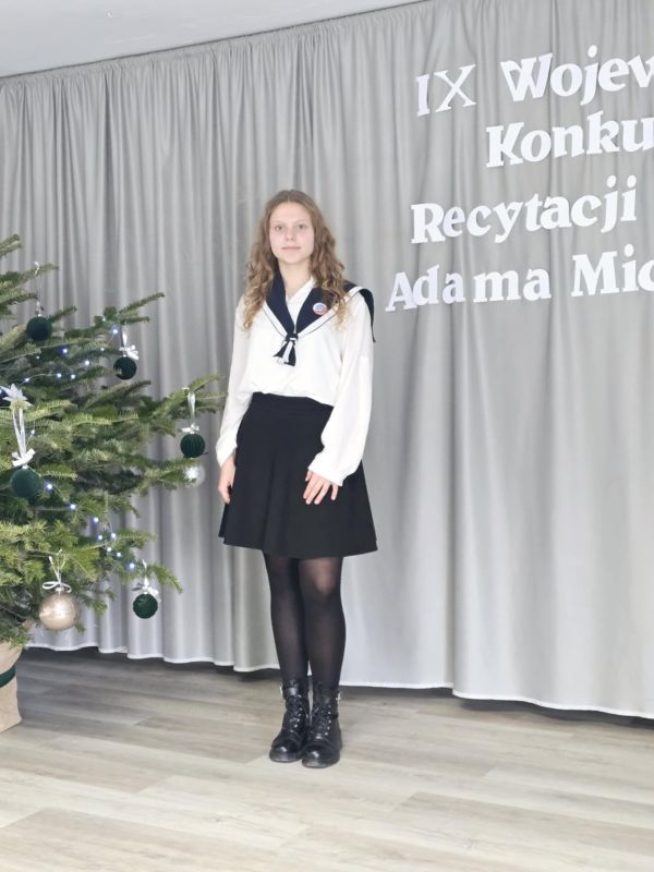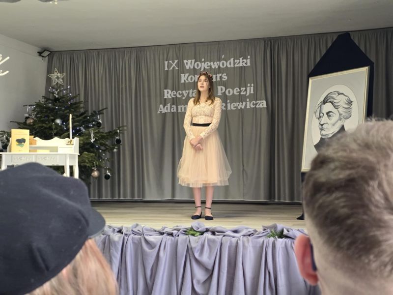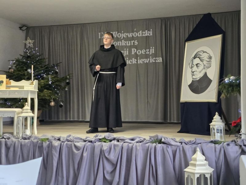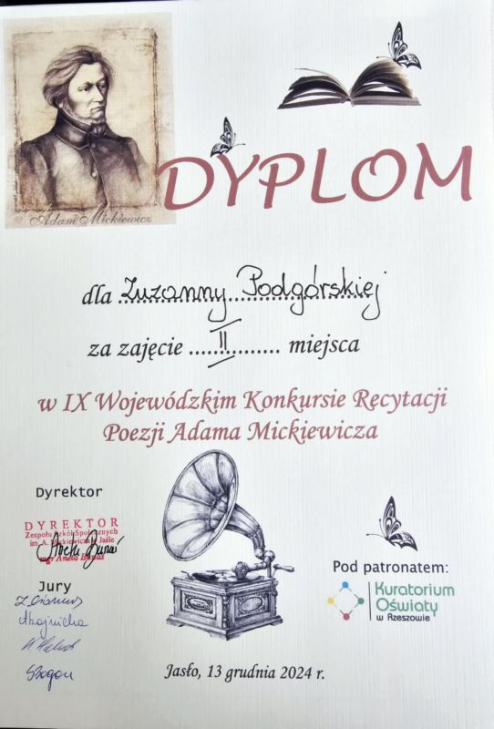 13 grudnia 2024 roku nasze uczennice: Maria Biernacka oraz Zuzanna Podgórska z klasy 8 b wzięły udział w IX Wojewódzkim Konkursie Recytacji Poezji Adama Mickiewicza odbywającym się pod patronatem Podkarpackiego Kuratora Oświaty w Rzeszowie. Trzydzieścioro recytatorów interpretowało wiersze wieszcza narodowego oraz fragmenty "Pana Tadeusza". Jury, któremu przewodniczyły panie Zofia Ciomcia oraz starsza wizytator Jolanta Strzępek, podkreśliło wysoki poziom prezentacji. Zuzia Podgórska zdobyła w konkursie zaszczytne II miejsce, czego jej serdecznie gratulujemy, jak również Pani Agacie Ochałek-Skałbie, która na zajęciach kółka recytatorskiego przygotowała ją do interpretacji fragmentu "Pana Tadeusza".