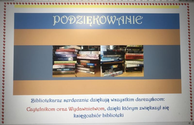 Składamy serdeczne podziękowanie za nieodpłatne przekazanie książek. Te miłe gesty pozostaną na długo w naszej pamięci, a podarowane książki przyczynią się do pomnożenia radości jaką daje czytanie.