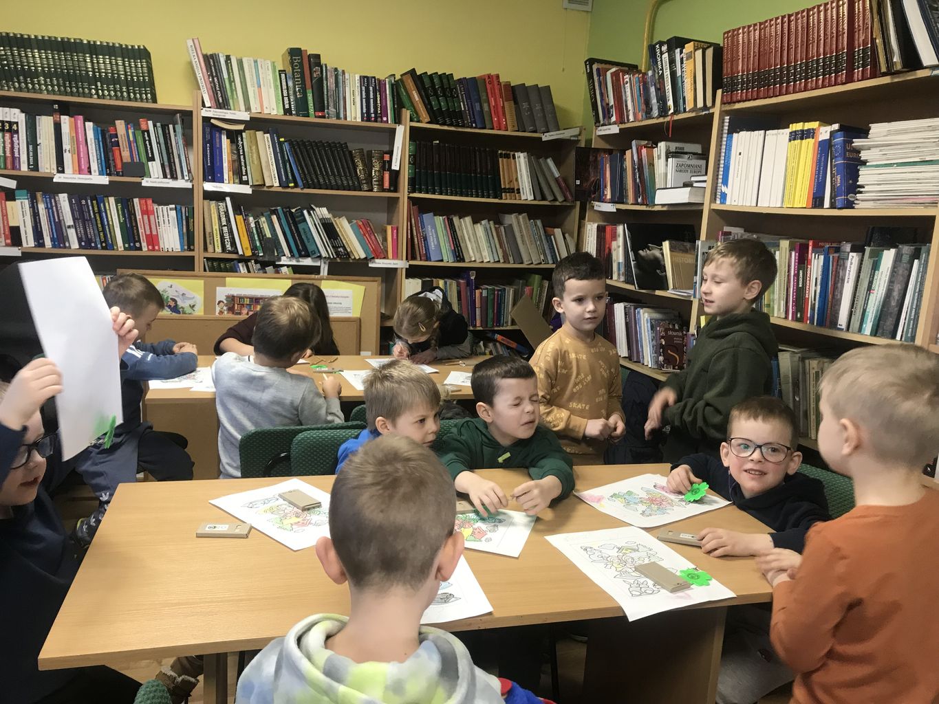 W dniu dzisiejszym rozpoczęliśmy ferie. 5 i 6 latki oraz panie wychowawczynie z Gminnego Przedszkola w Kołaczycach odwiedziły naszą bibliotekę, gdzie odbyło się spotkanie z dzielnicowym