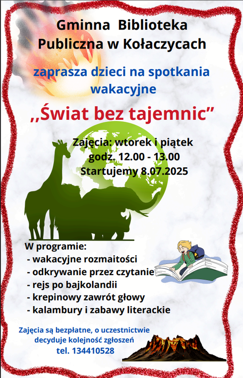 W programie: - wakacyjne rozmaitości - odkrywanie przez czytanie - rejs po bajkolandii - krepinowy zawrót głowy - kalambury i zabawy literackie