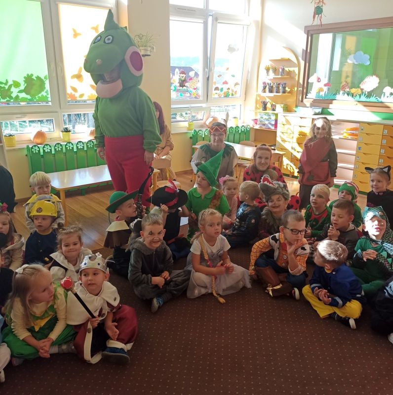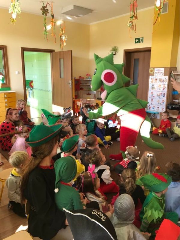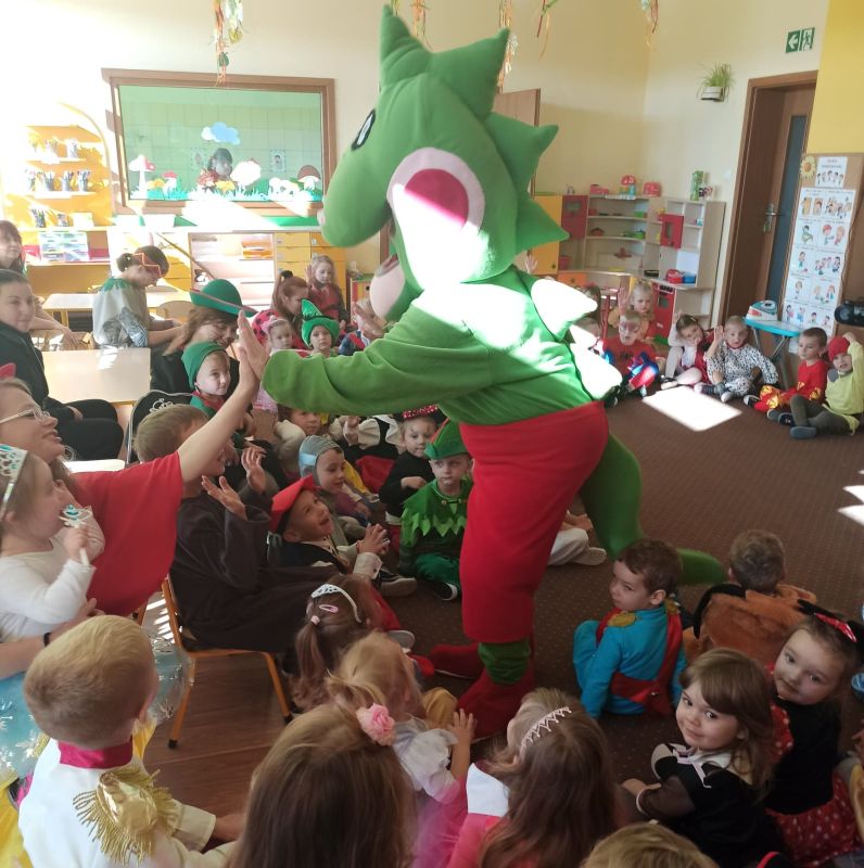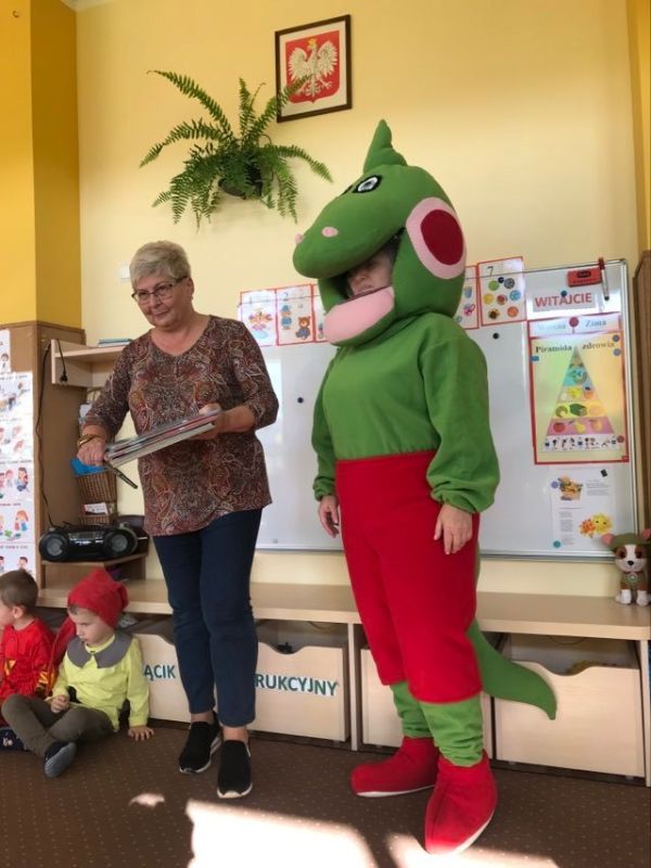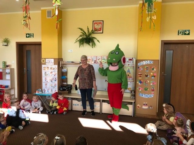 27.10.2022 r. bibliotekarki i Smok Maciuś udały się do Przedszkola Niepublicznego Sióstr Serafitek w Bieździadce, gdzie czekały na nas kolorowe postacie bajkowe.