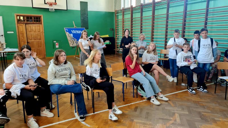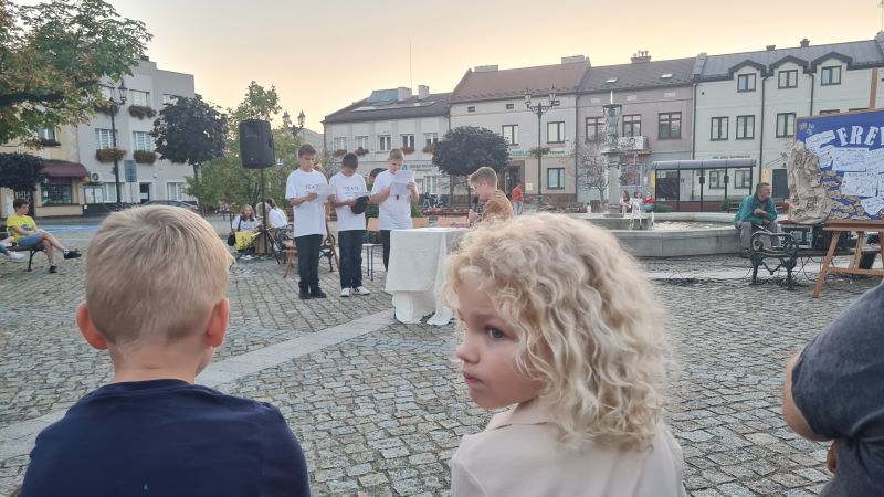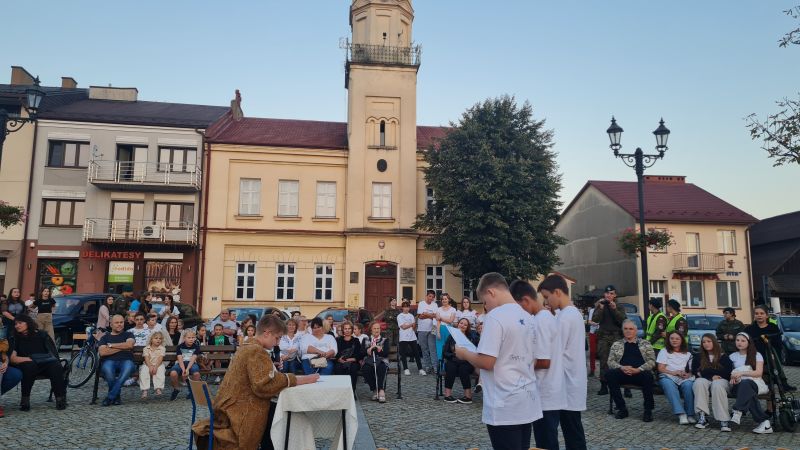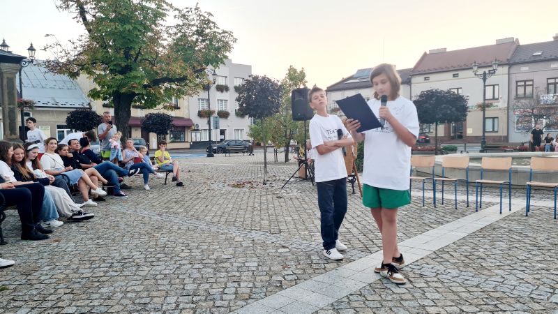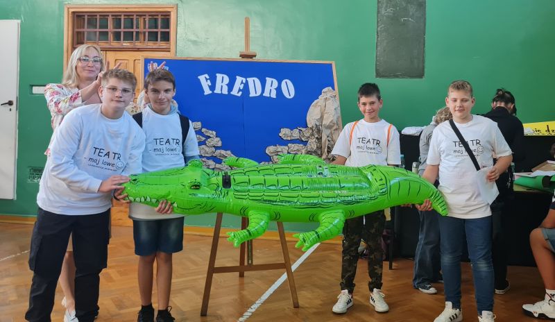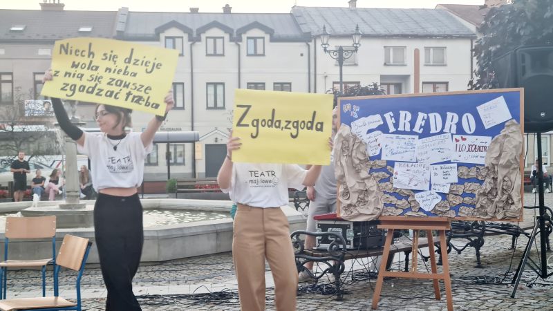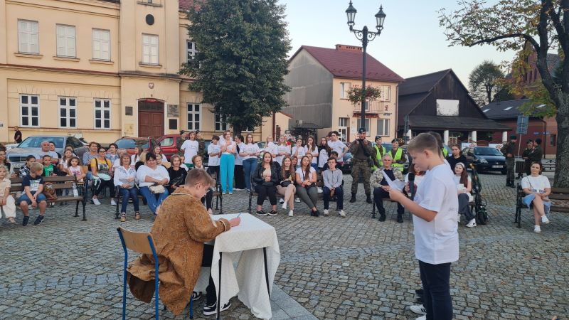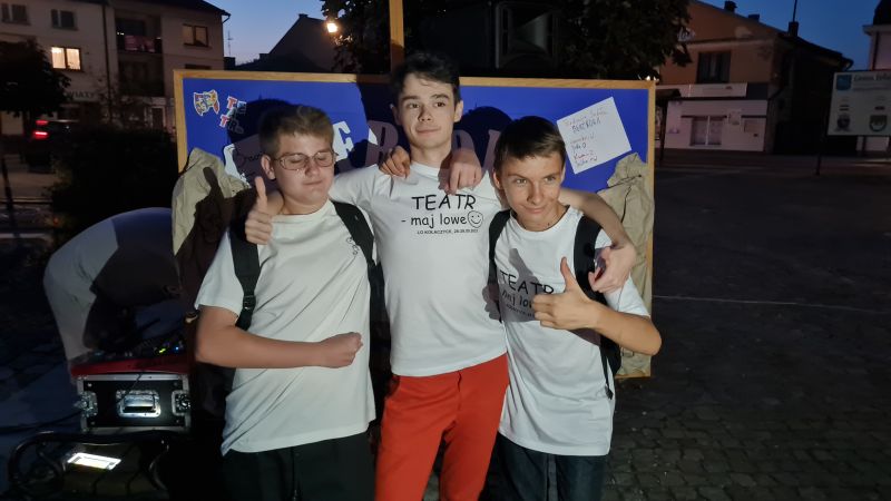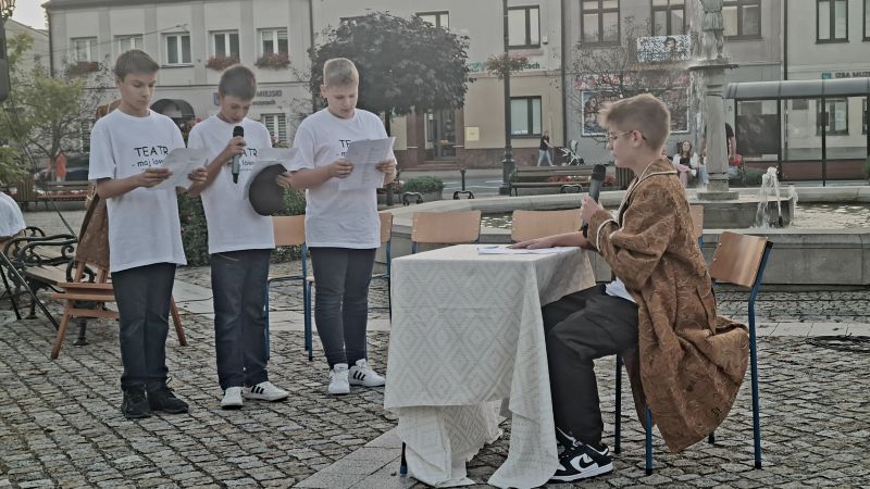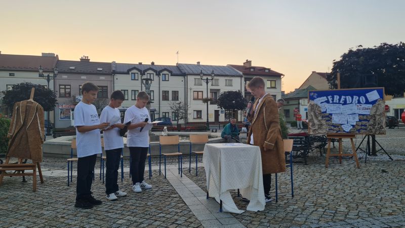 Uczniowie naszej szkoły zostali zaproszeni do wzięcia udziału w warsztatach teatralnych organizowanych przez Liceum Ogólnokształcące w Kołaczycach, które odbywały się w dniach 28 - 29 września br. Podsumowaniem warsztatów był happening na kołaczyckim Rynku. A wszystko po to, by zaakcentować Rok Aleksandra Fredry - wybitnego polskiego komediopisarza, którego teksty są arcydziełami gatunku. Wybrzmiały one głosami uczniów szkół powiatu i spoza powiatu jasielskiego, a pochodzili oni z: Bieździedzy, Błażkowej, Brzostku, Brzysk, Kołaczyc i Lublicy. Jak stwierdzili dorośli uczestnicy happening'u, "nic tak nie cieszy, jak młodzież czytająca polską klasykę literatury oderwana na kilka godzin od wirtualnej rzeczywistości". Nasi zdolni aktorzy wybrani przez Panią Agatę Ochałek-Skałbę, a więc: Fabian Borowiecki, Maksymilian Gruchacz, Oliwier Leśniak i Jakub Mocek świetnie się zaprezentowali w nieśmiertelnej "Zemście" w rolach Rejenta i mularzy. Na koniec happeningu wystąpiły także Pani Skałba i Pani Samborska wywołane przez organizatorów z widowni :). Warsztaty prowadził absolwent naszej szkoły - Jonatan Maciejowski, a happening zorganizowała Pani Grażyna Żygłowicz - Wicedyrektor LO w Kołaczycach i pomysłodawczyni projektu.