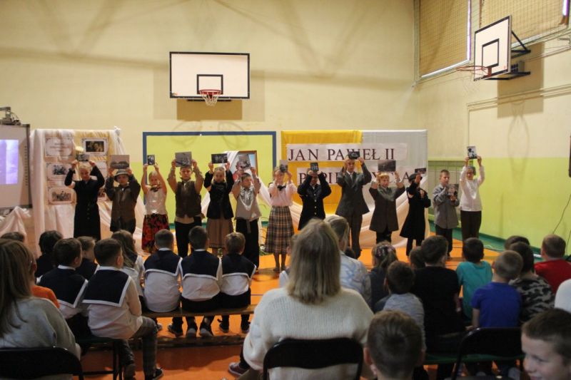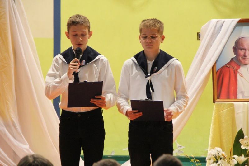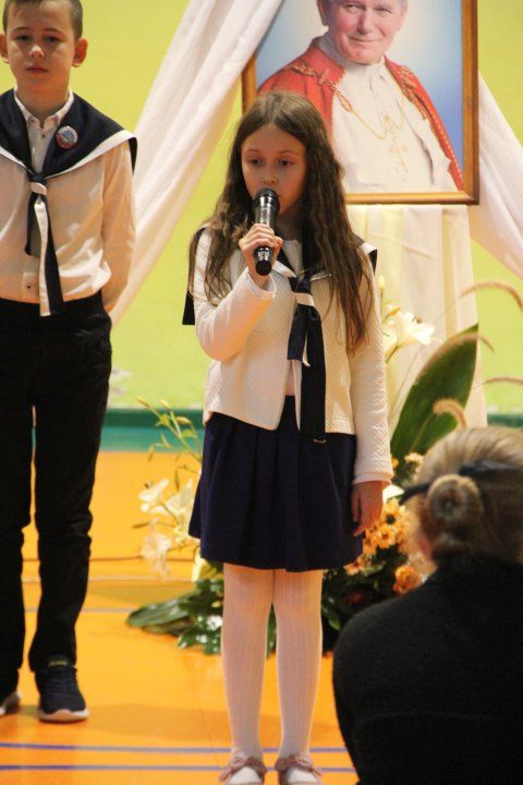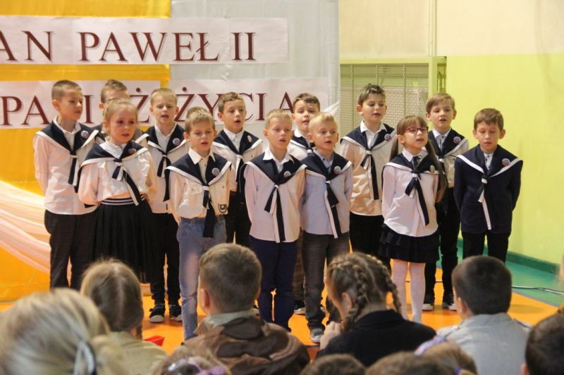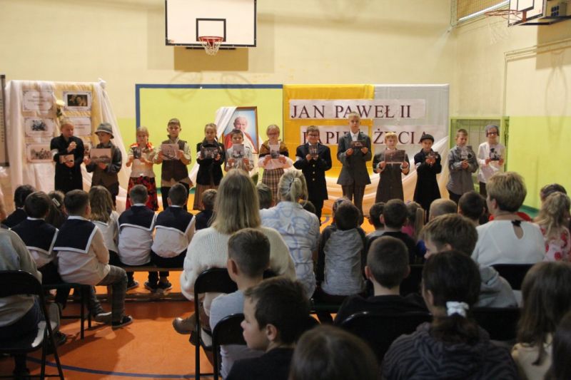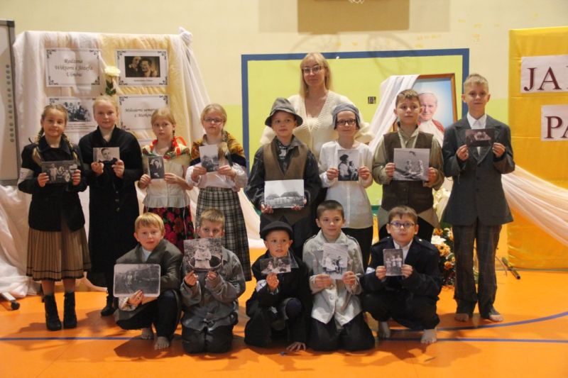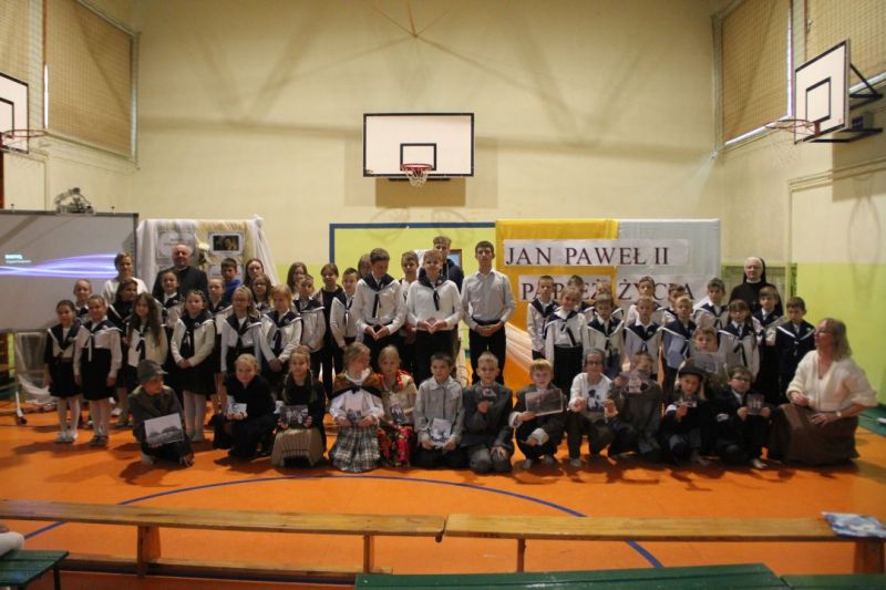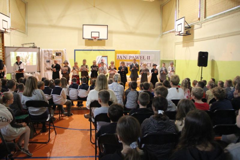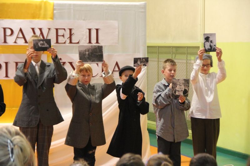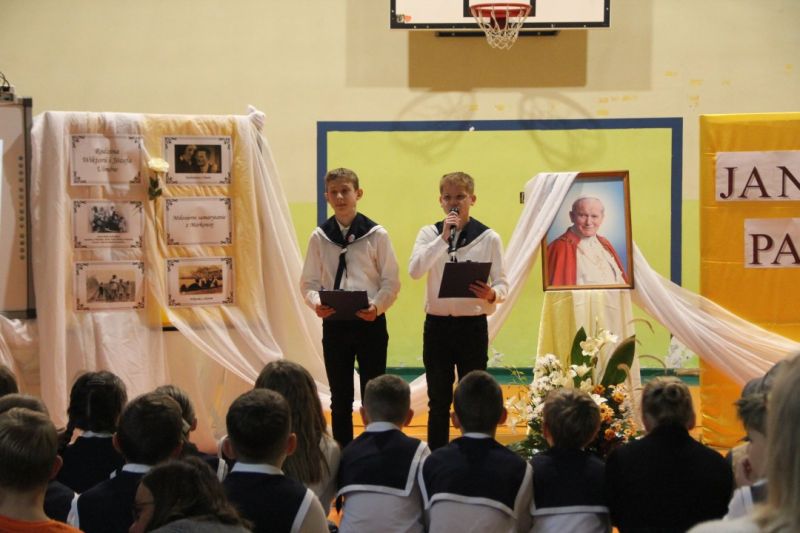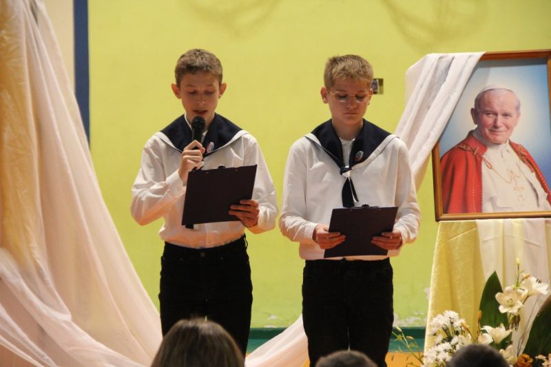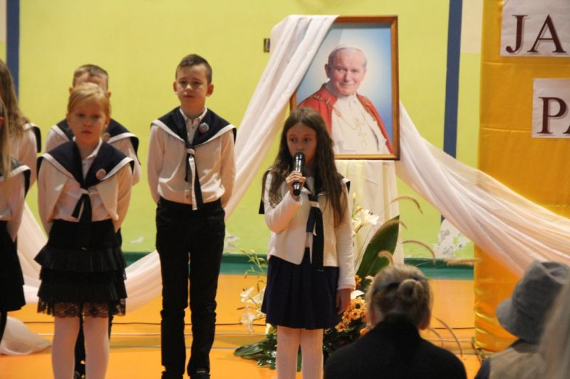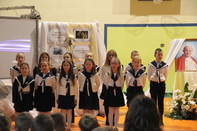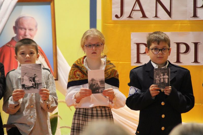 Nasza szkoła postanowiła upamiętnić osobę św. Jana Pawła II oraz bł. Rodzinę Ulmów programem artystycznym wykonanym przez dzieci i młodzieży. Najpierw wystąpiły klasy II i III. Wysłuchaliśmy słynną piosenkę "Wadowice" oraz wiersz "Stokrotka". Następnie chłopcy z klasy VIII opowiedzieli o wydarzeniach w Markowej i męczeństwie Ulmów zamordowanych przez hitlerowców w czasie okupacji. Klasa IV b z kolei przybliżyła postacie Wiktorii i Józefa oraz ich siedmiorga dzieci, jak również ukrywanych przez nich Żydów w czasie Holocaustu. Opowiedzieli również o bohaterstwie rodziny Kopciów z Sowiny, którzy ukrywali rodzinę Żyda sklepikarza oraz innych Polakach "Sprawiedliwych wśród Narodów Świata". Występ zakończył się etiudą w wykonaniu młodzieży z klasy VIII traktującej o walce człowieka ze złem i zwycięstwie dobra oraz siłę wiary chrześcijańskiej. Program zakończył się wspólną modlitwą i odśpiewaniem " Barki".Po akademii głos zabrała Pani Wicedyrektor Beata Biernacka, dziękując s. Wincencie, ks. Grzegorzowi Guziorowi oraz pani Agacie Ochałek - Skałbie za przygotowanie dzisiejszej uroczystości. Pani Wicedyrektor podkreśliła wagę przesłania zawartego w przedstawionym programie, zachęcając wszystkich do bezinteresownej pomocy drugiemu człowiekowi oraz wzajemnej życzliwości.