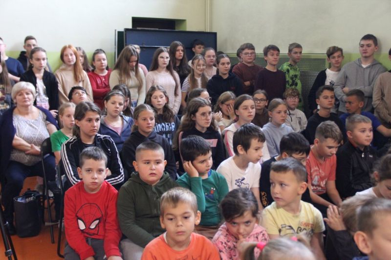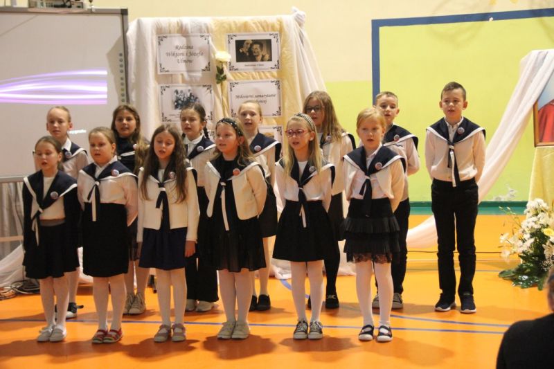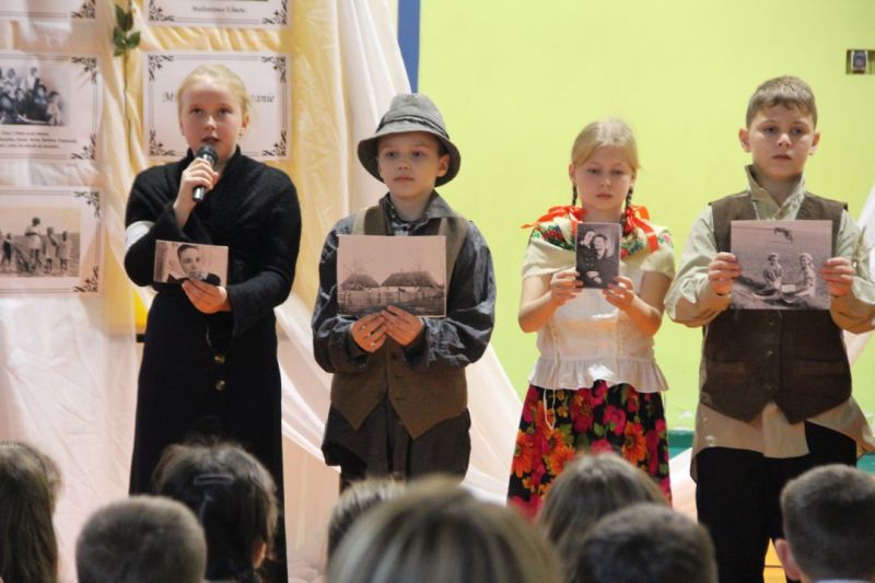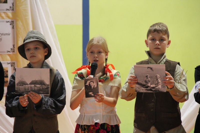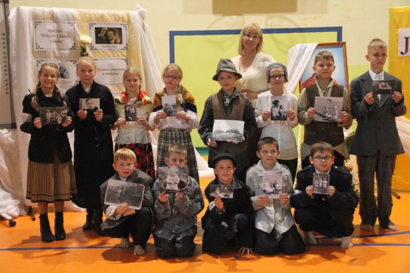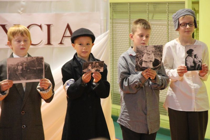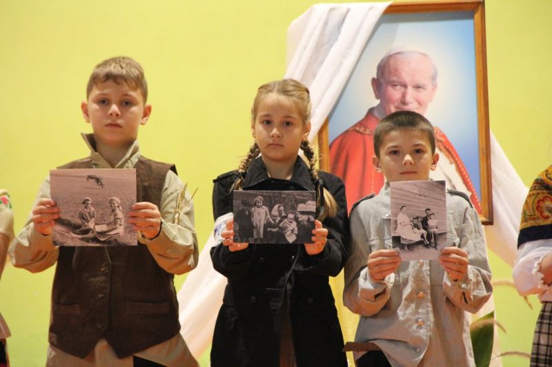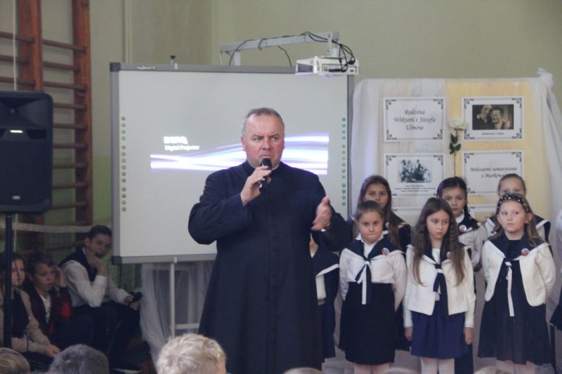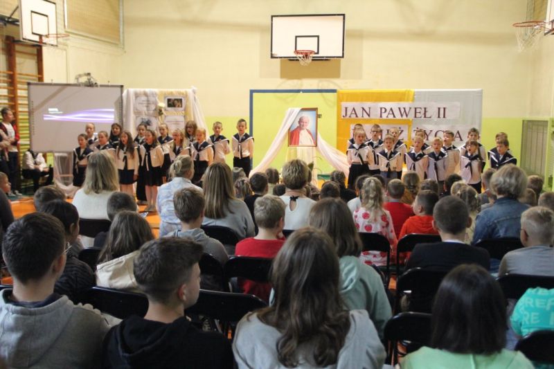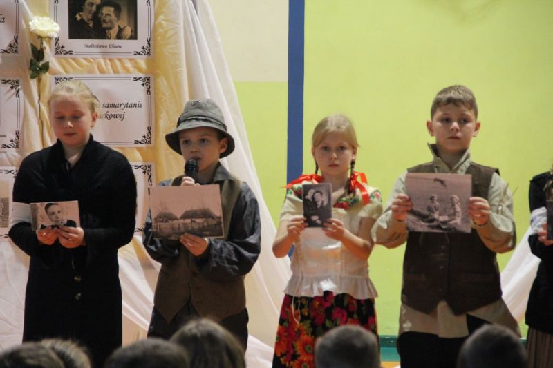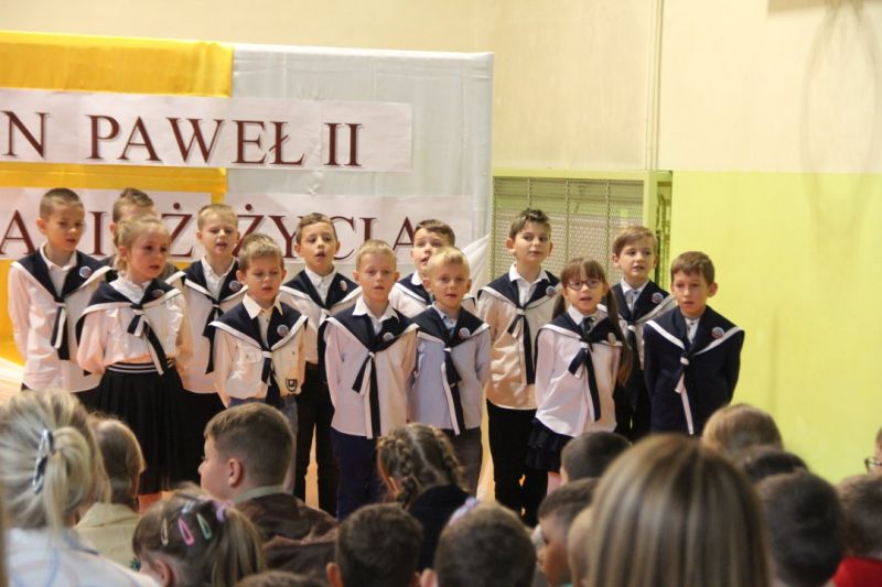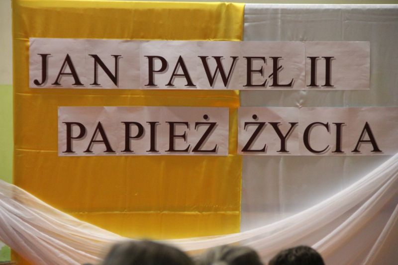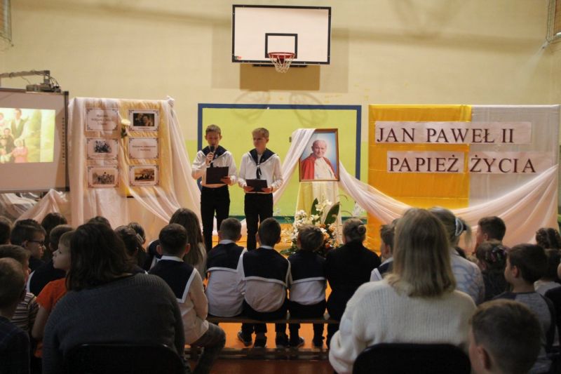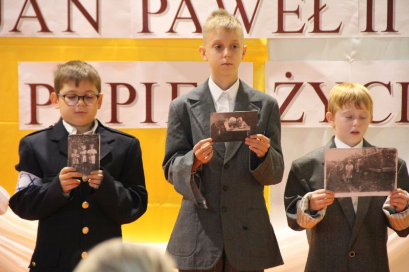 Nasza szkoła postanowiła upamiętnić osobę św. Jana Pawła II oraz bł. Rodzinę Ulmów programem artystycznym wykonanym przez dzieci i młodzieży. Najpierw wystąpiły klasy II i III. Wysłuchaliśmy słynną piosenkę "Wadowice" oraz wiersz "Stokrotka". Następnie chłopcy z klasy VIII opowiedzieli o wydarzeniach w Markowej i męczeństwie Ulmów zamordowanych przez hitlerowców w czasie okupacji. Klasa IV b z kolei przybliżyła postacie Wiktorii i Józefa oraz ich siedmiorga dzieci, jak również ukrywanych przez nich Żydów w czasie Holocaustu. Opowiedzieli również o bohaterstwie rodziny Kopciów z Sowiny, którzy ukrywali rodzinę Żyda sklepikarza oraz innych Polakach "Sprawiedliwych wśród Narodów Świata". Występ zakończył się etiudą w wykonaniu młodzieży z klasy VIII traktującej o walce człowieka ze złem i zwycięstwie dobra oraz siłę wiary chrześcijańskiej. Program zakończył się wspólną modlitwą i odśpiewaniem " Barki".Po akademii głos zabrała Pani Wicedyrektor Beata Biernacka, dziękując s. Wincencie, ks. Grzegorzowi Guziorowi oraz pani Agacie Ochałek - Skałbie za przygotowanie dzisiejszej uroczystości. Pani Wicedyrektor podkreśliła wagę przesłania zawartego w przedstawionym programie, zachęcając wszystkich do bezinteresownej pomocy drugiemu człowiekowi oraz wzajemnej życzliwości.