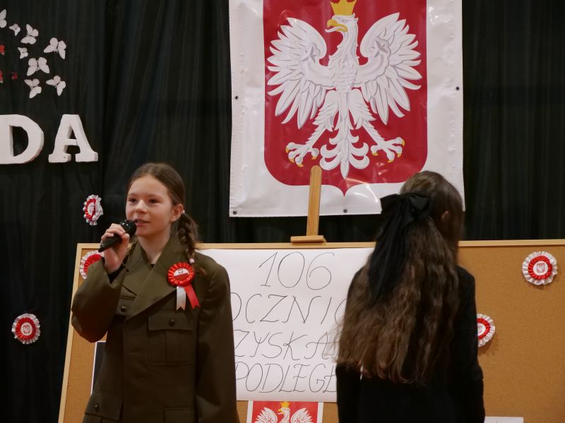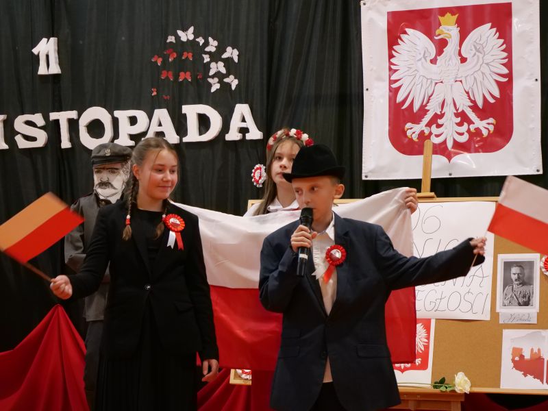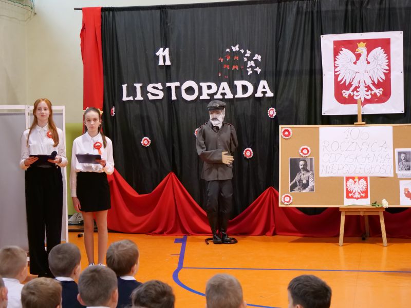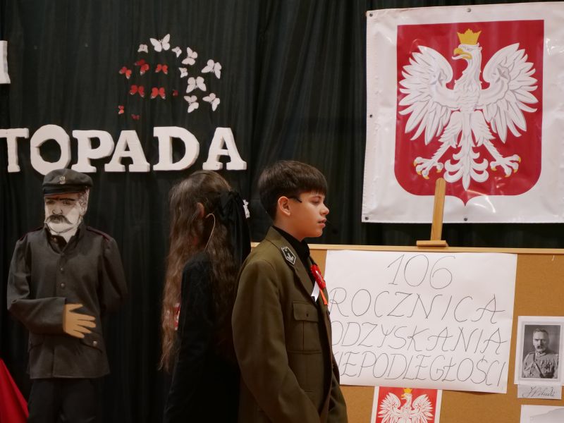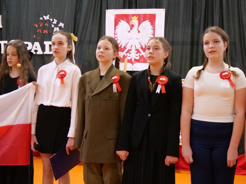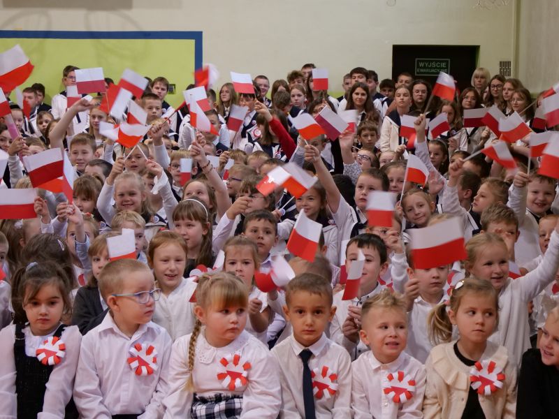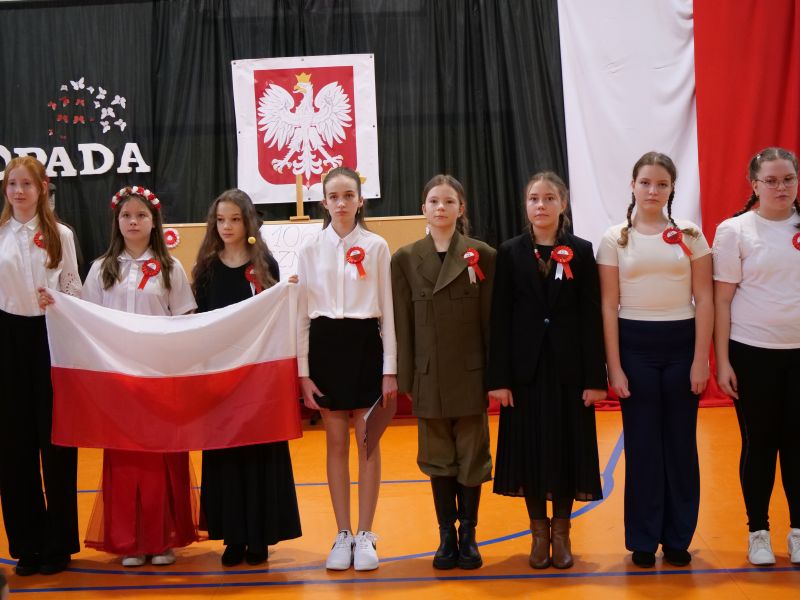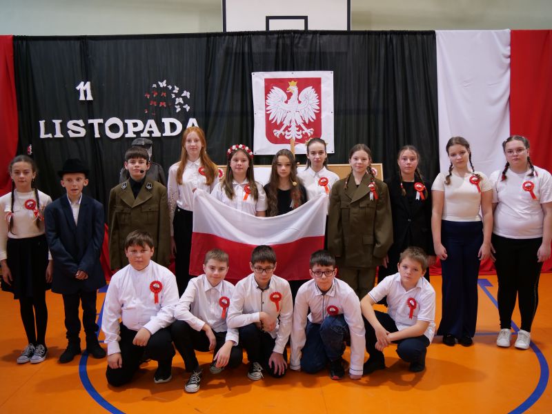 W ramach obchodów Narodowego Święta Niepodległości w naszej szkole odbyła się uroczysta akademia. Spotkanie rozpoczęliśmy od wspólnego odśpiewania Hymnu Narodowego, oddając tym samym hołd wszystkim, dzięki którym możemy dziś cieszyć się wolnością. Uczniowie klasy 6b pod opieką Pani Marleny Famurat oraz Panów Wojciecha Wiejowskiego i Wojciecha Merkwy, przygotowali wzruszający program artystyczny, który przypomniał nam kluczowe wydarzenia z naszej historii, trudne drogi do wolności i postawy bohaterów, którzy w najcięższych chwilach walczyli o to, by Polska była wolna i niepodległa.