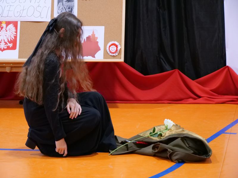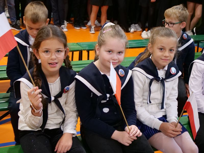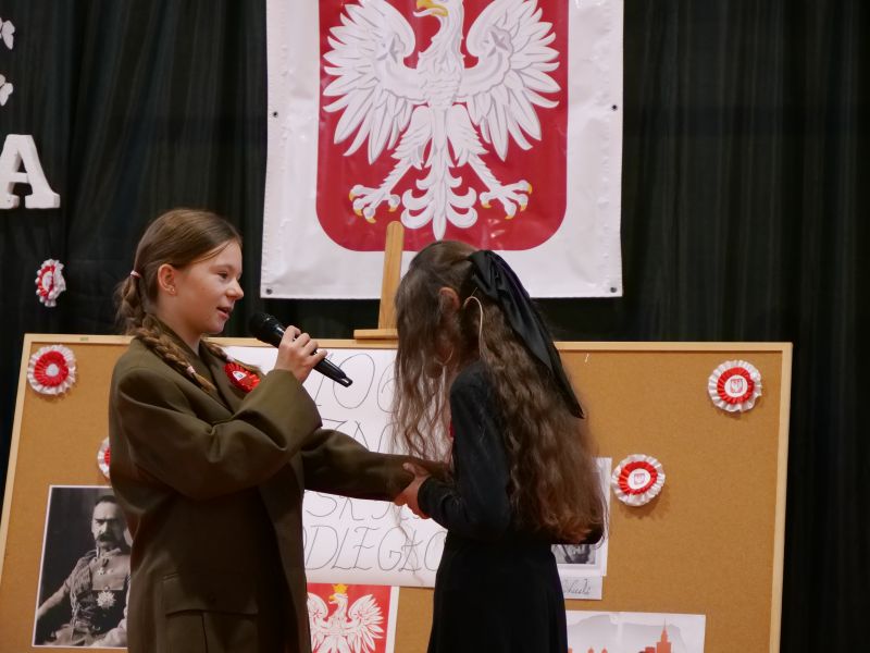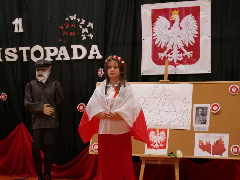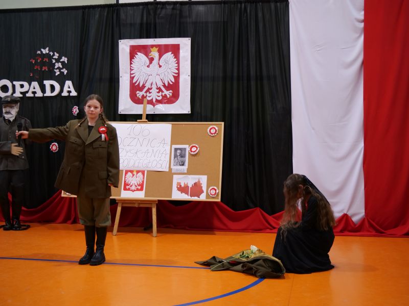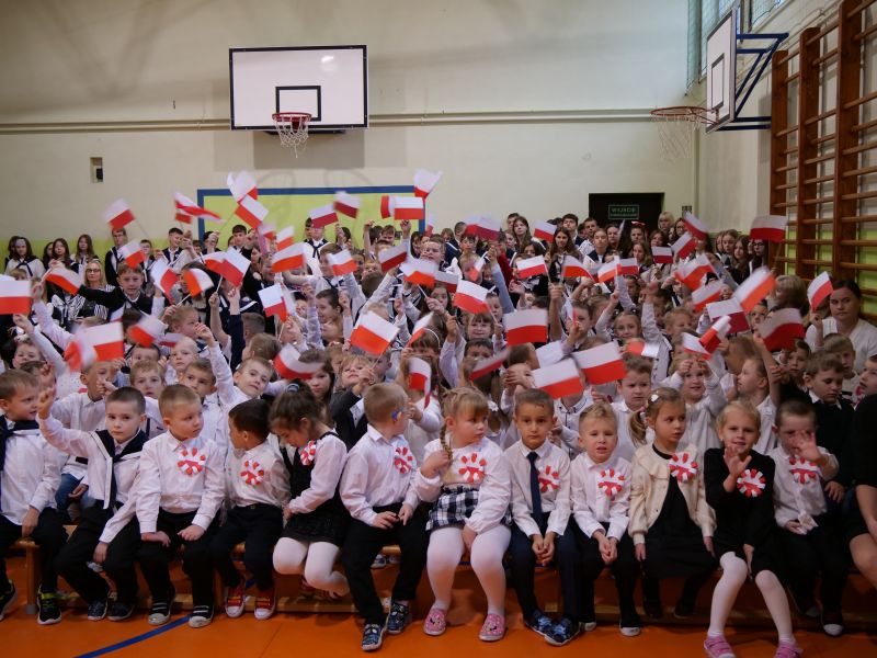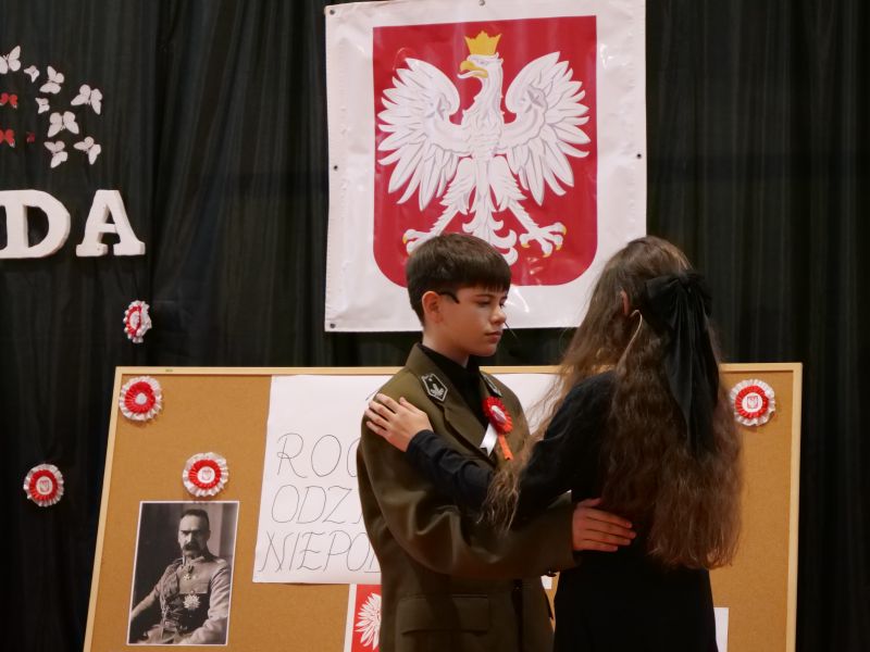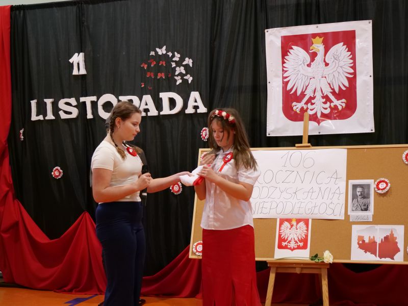 W ramach obchodów Narodowego Święta Niepodległości w naszej szkole odbyła się uroczysta akademia. Spotkanie rozpoczęliśmy od wspólnego odśpiewania Hymnu Narodowego, oddając tym samym hołd wszystkim, dzięki którym możemy dziś cieszyć się wolnością. Uczniowie klasy 6b pod opieką Pani Marleny Famurat oraz Panów Wojciecha Wiejowskiego i Wojciecha Merkwy, przygotowali wzruszający program artystyczny, który przypomniał nam kluczowe wydarzenia z naszej historii, trudne drogi do wolności i postawy bohaterów, którzy w najcięższych chwilach walczyli o to, by Polska była wolna i niepodległa.