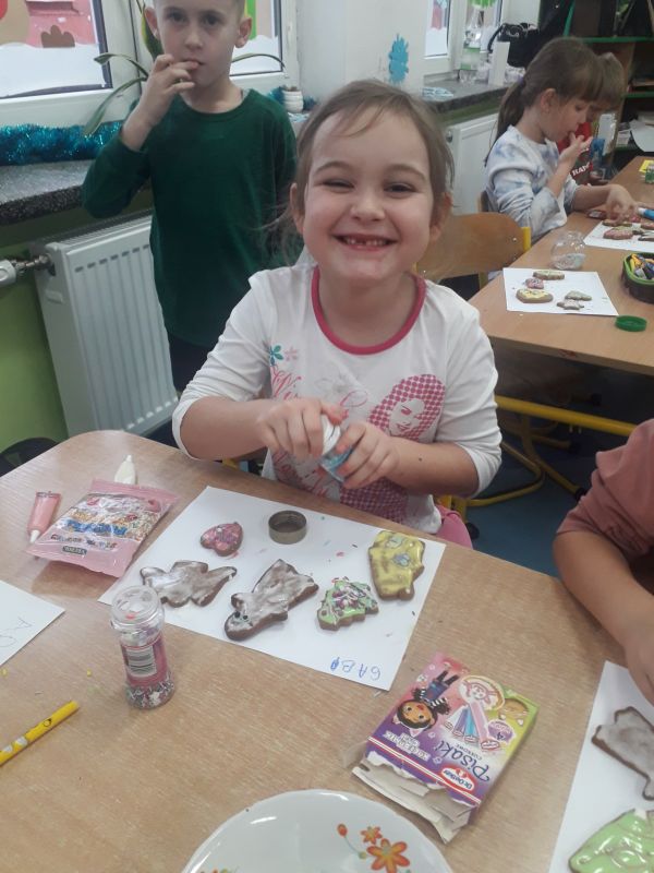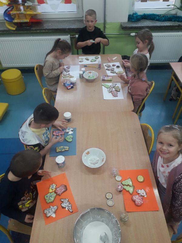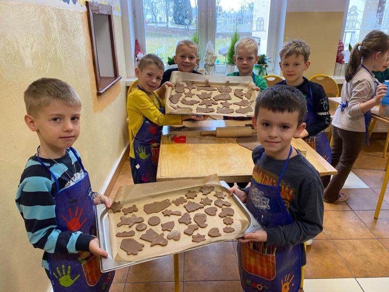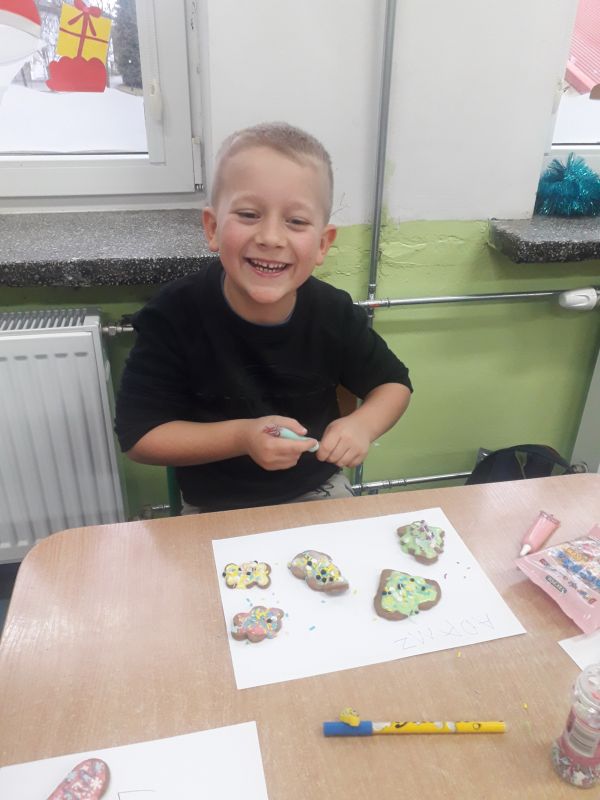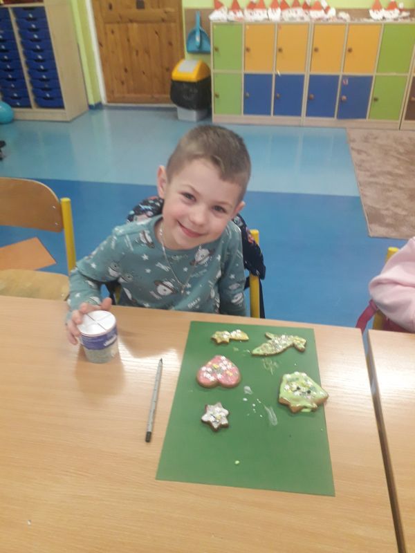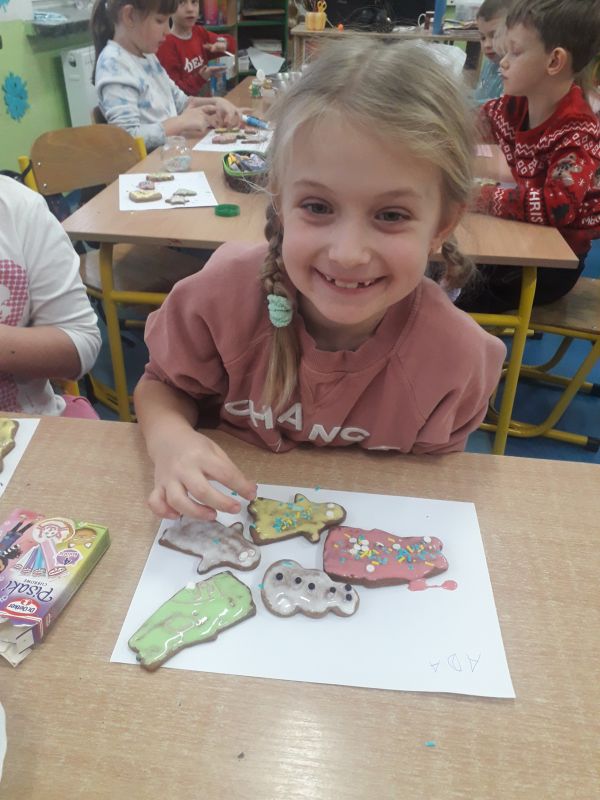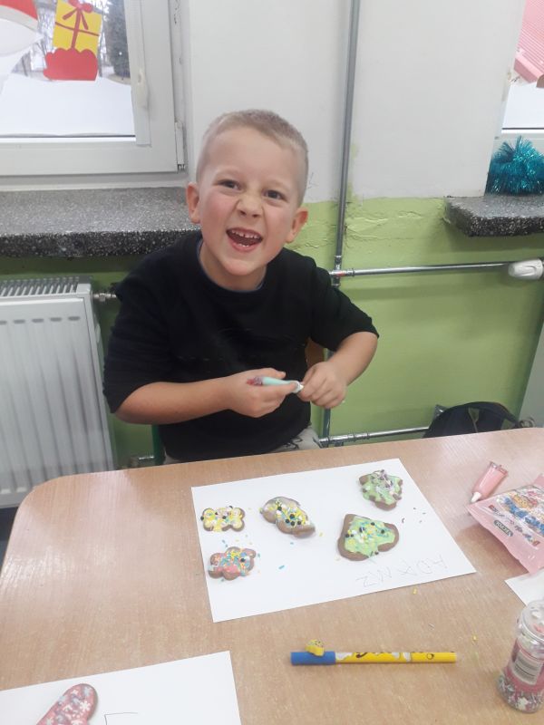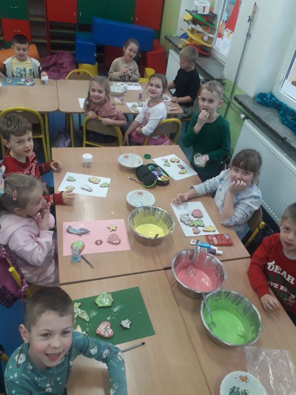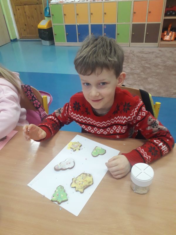 W piątek 13 grudnia i poniedziałek 16 grudnia oddziały przedszkolne piekły i dekorowały w szkole pierniczki. Wszystkie dzieci z ogromną radością wałkowały ciasto, wycinały foremkami przeróżne bożonarodzeniowe kształty. Cały proces pieczenia i kształtowania własnoręcznie wykonanych ciasteczek sprawił wszystkim uczestnikom ogromną radość. Ten twórczy dzień bardzo się dzieciom podobał i wprowadził w magiczną atmosferę Świąt Bożego Narodzenia. Słodki korzenny zapach jeszcze długo unosił się w naszej szkole.