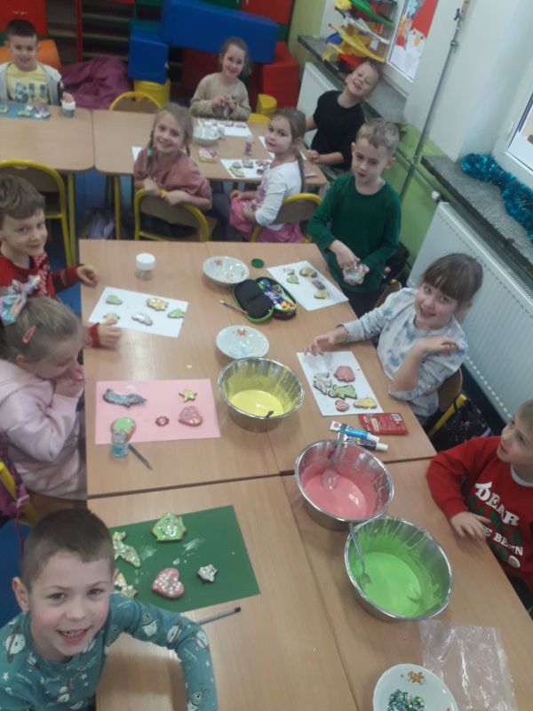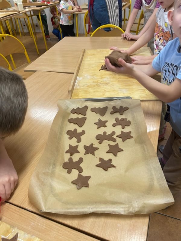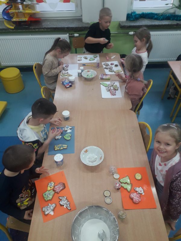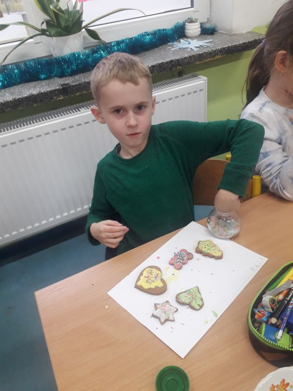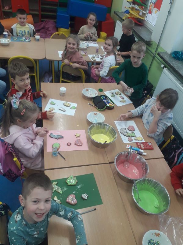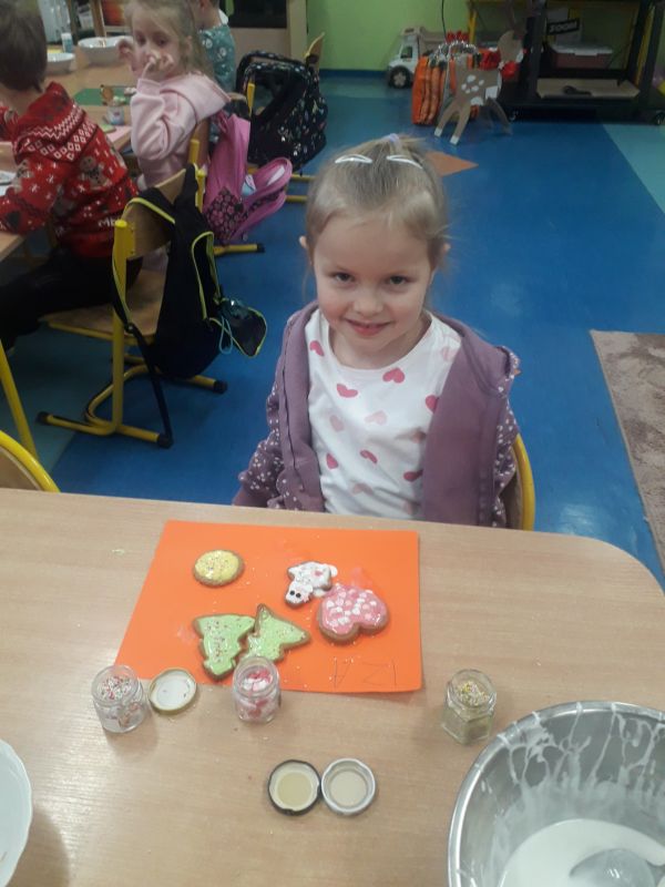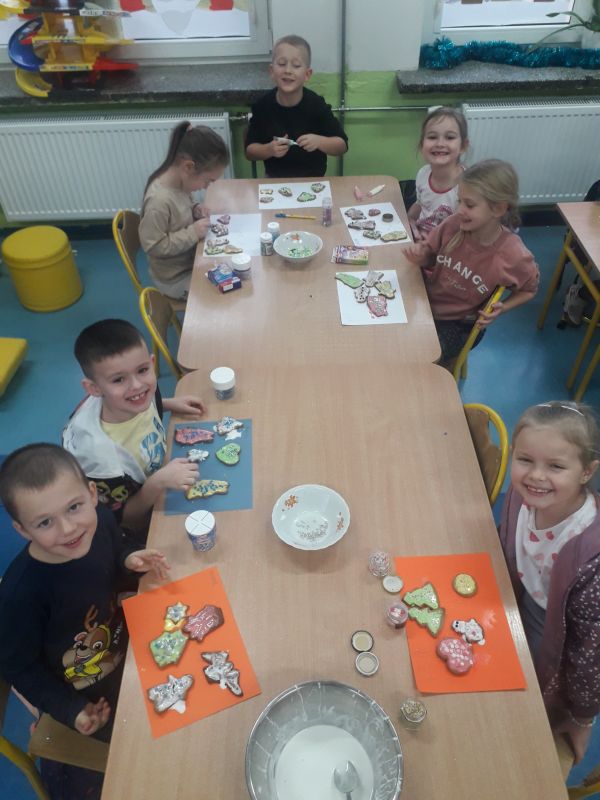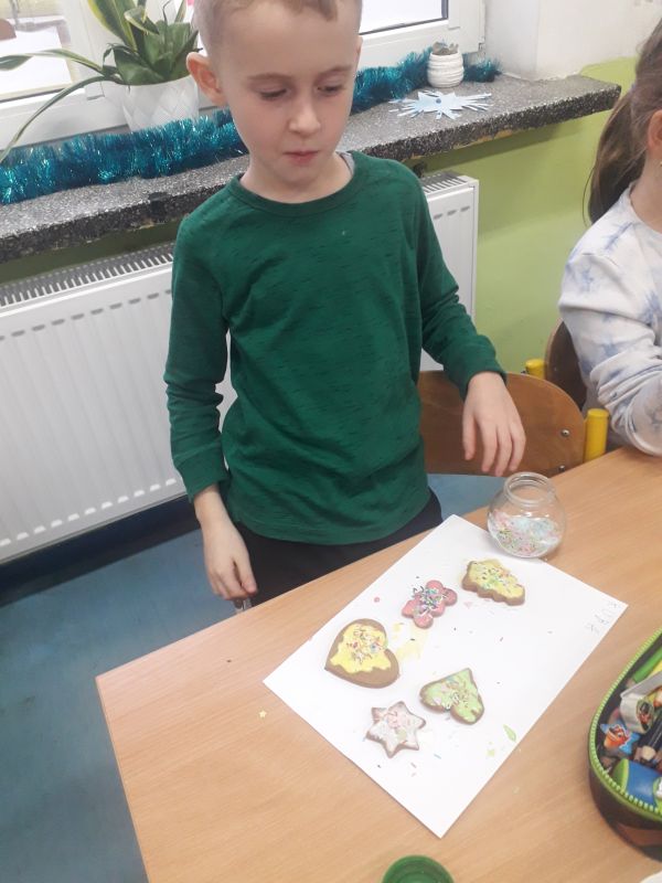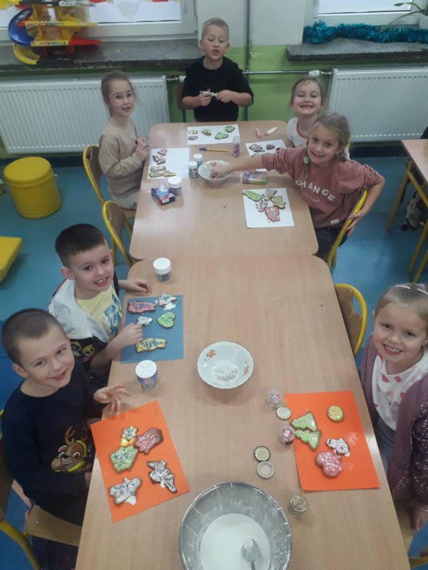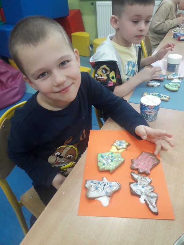 W piątek 13 grudnia i poniedziałek 16 grudnia oddziały przedszkolne piekły i dekorowały w szkole pierniczki. Wszystkie dzieci z ogromną radością wałkowały ciasto, wycinały foremkami przeróżne bożonarodzeniowe kształty. Cały proces pieczenia i kształtowania własnoręcznie wykonanych ciasteczek sprawił wszystkim uczestnikom ogromną radość. Ten twórczy dzień bardzo się dzieciom podobał i wprowadził w magiczną atmosferę Świąt Bożego Narodzenia. Słodki korzenny zapach jeszcze długo unosił się w naszej szkole.