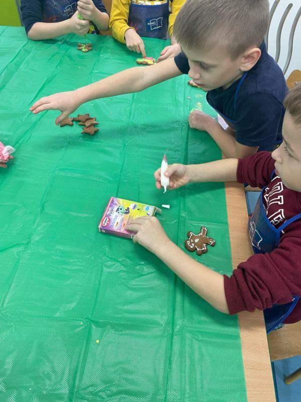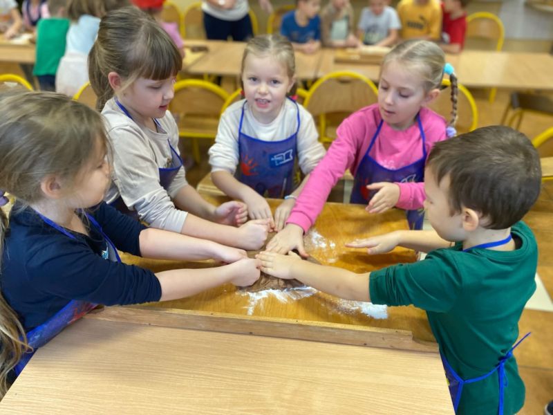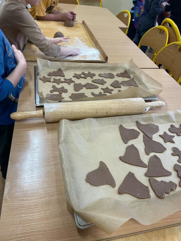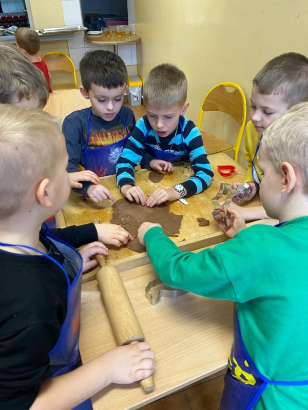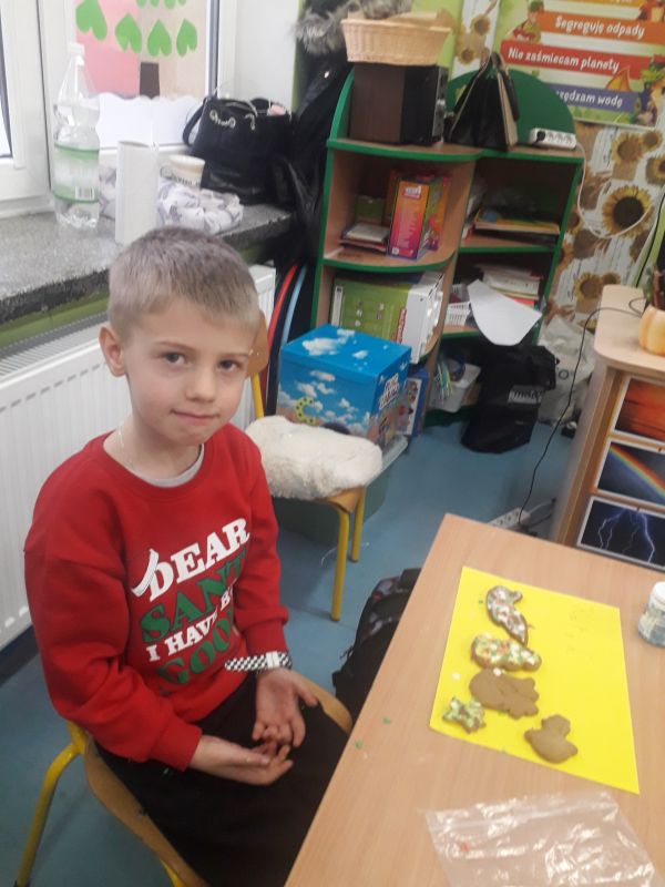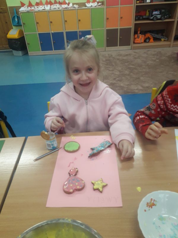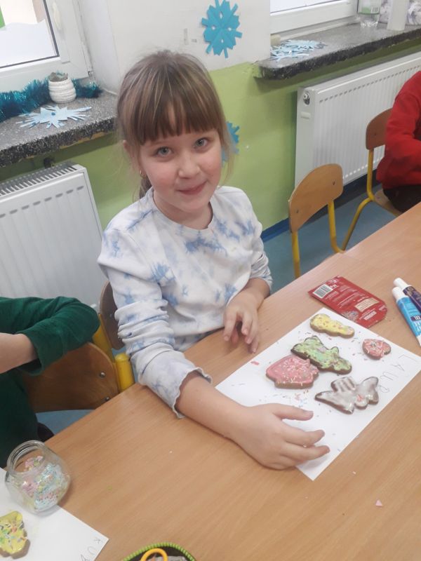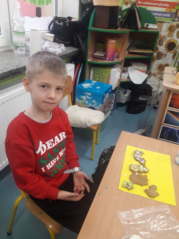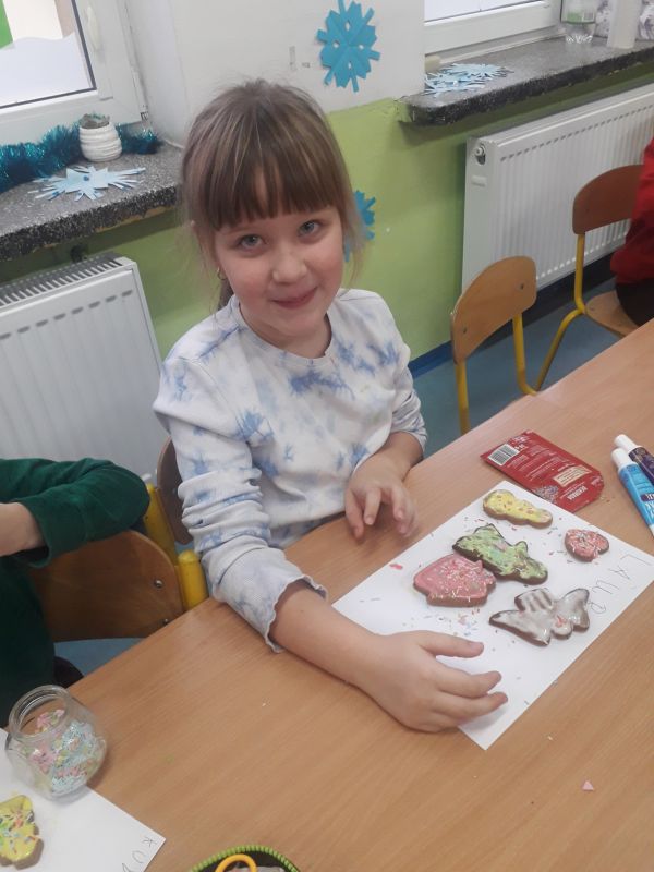 W piątek 13 grudnia i poniedziałek 16 grudnia oddziały przedszkolne piekły i dekorowały w szkole pierniczki. Wszystkie dzieci z ogromną radością wałkowały ciasto, wycinały foremkami przeróżne bożonarodzeniowe kształty. Cały proces pieczenia i kształtowania własnoręcznie wykonanych ciasteczek sprawił wszystkim uczestnikom ogromną radość. Ten twórczy dzień bardzo się dzieciom podobał i wprowadził w magiczną atmosferę Świąt Bożego Narodzenia. Słodki korzenny zapach jeszcze długo unosił się w naszej szkole.