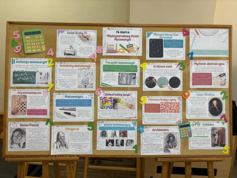 Matematyka otacza nas wszędzie i mamy z nią do czynienia w niemal każdym aspekcie naszego życia. Jako królowa nauk ma swoje święto, które przypada na dzień 12 marca. W naszej szkole obchodziliśmy ów dzień 14 marca. W tym dniu przygotowano dla uczniów klas 1- 8 wyjątkowe zajęcia z zagadkami i quizami matematycznymi. Celem takich zajęć jest lepsze poznanie zagadnień związanych z własnościami liczb naturalnych. Rozwiązywanie zadań miało sprawić przyjemność, a nie być kolejnym testem. Zadania nie wymagały wybitnej wiedzy matematycznej – wystarczył otwarty umysł i chęć do zabawy, a w ostateczności - szczęście. Dzień Matematyki zorganizowaliśmy po to, aby dać uczniom trochę odmiany w nauce tego trudnego przedmiotu. Organizatorką wydarzenia była Pani Wioleta Mikoś we współpracy z Panią Elżbietą Tutaj.