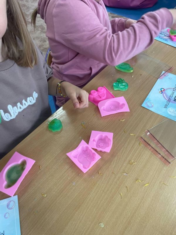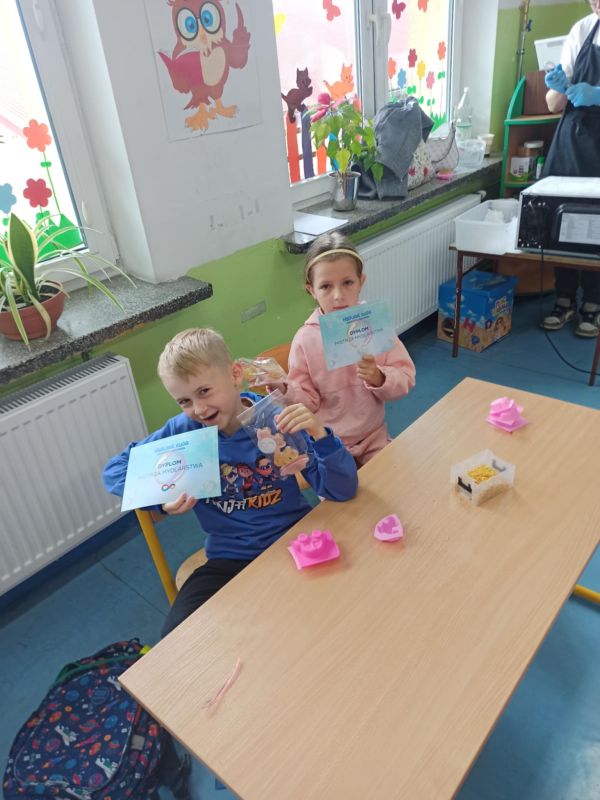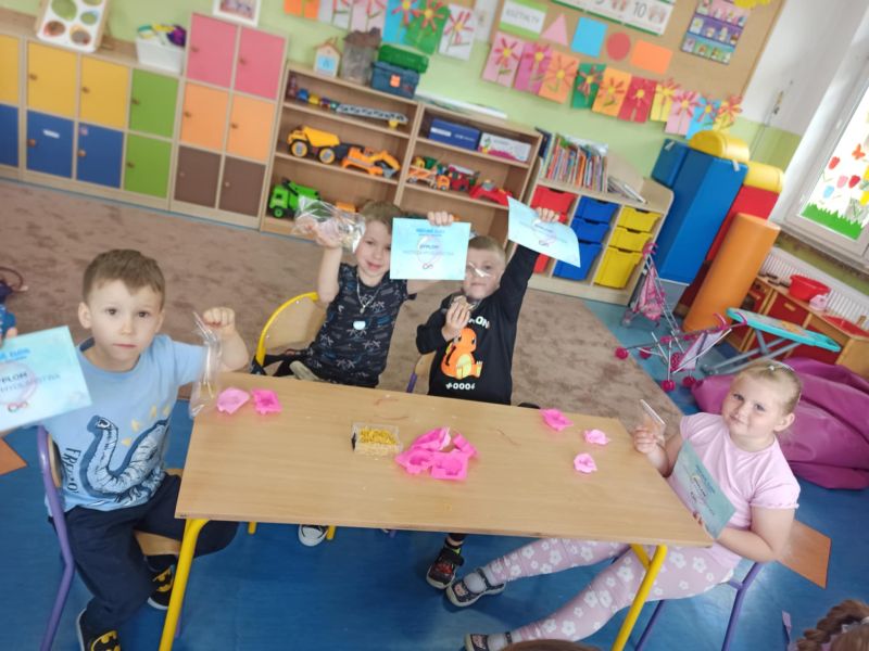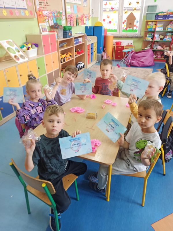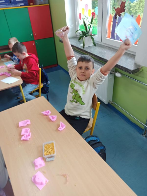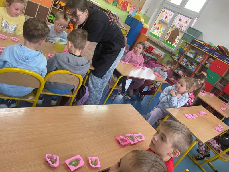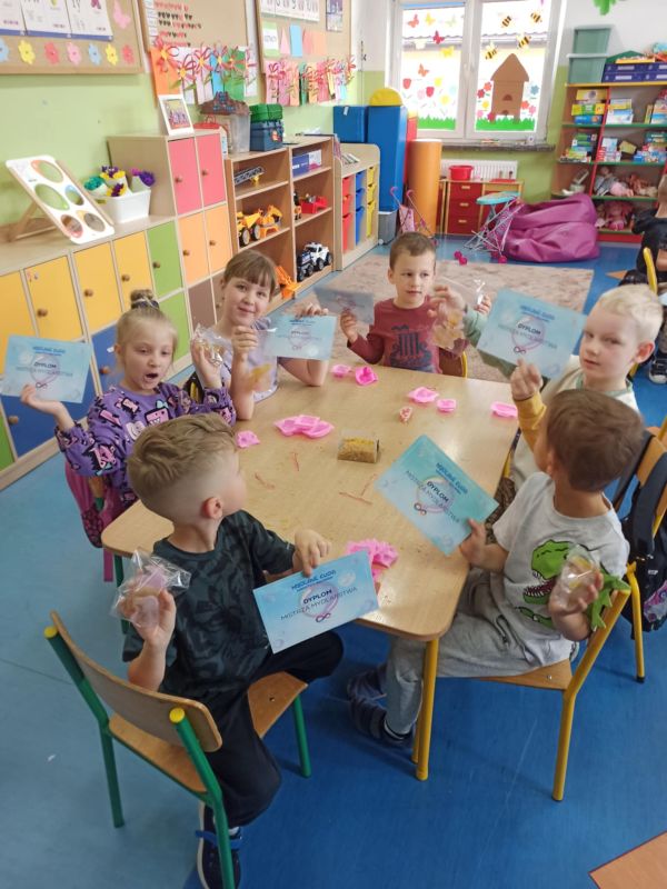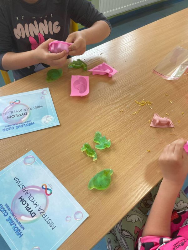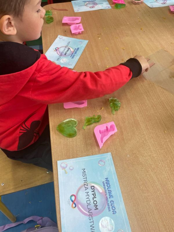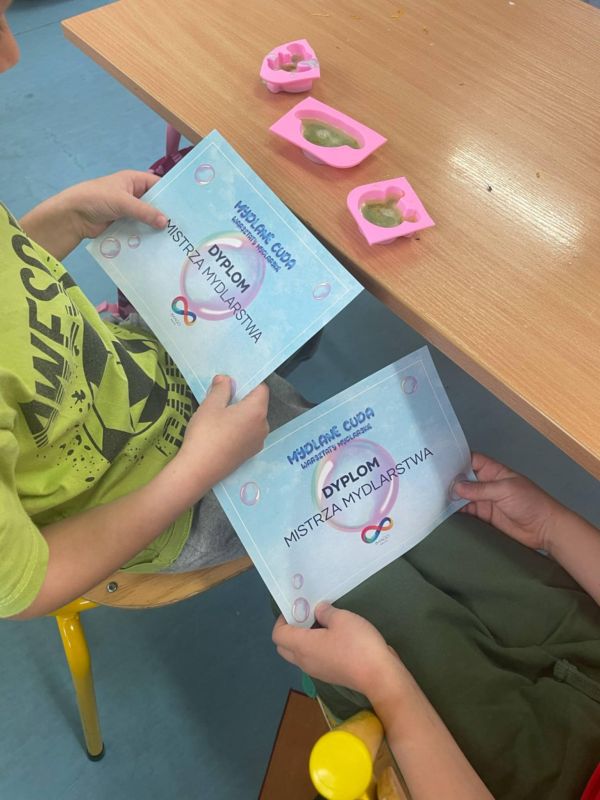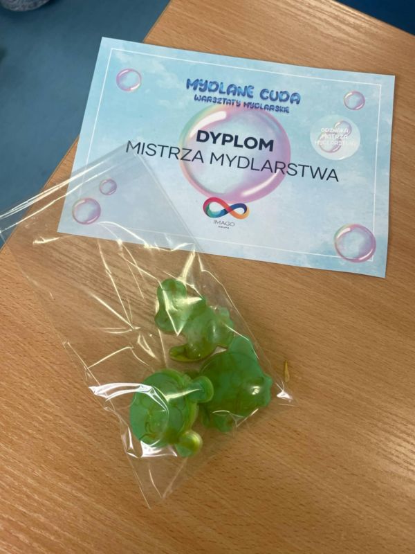 8 maja przedszkolaki z grupy 0 A, 0 B i 0 C przeniosły się do krainy cudownych zapachów i barw. Dzieci były uczestnikami kreatywnych warsztatów mydlarskich, prowadzonych przez Grupę Imago, podczas których tworzyły swoje własne oryginalne mydełka. Na wstępie dowiedzieliśmy się kilka ciekawostek o mydle, poznaliśmy historię jego powstawania, z czego powstaje mydło i jak długo powinno się myć ręce aby były czyste! Jednak głównym zadaniem, było stworzenie własnego, małego i niepowtarzalnego mydełka glicerynowego tj. ekologicznego. Dzieci miały możliwość, za pomocą zmysłów zdobywać nowe doświadczenia. Na zakończenie spotkania każdy uczestnik otrzymał DYPLOM MISTRZA MYDLARSTWA, a szkoła otrzymało Certyfikat Placówki wspierającej twórczość u dzieci.