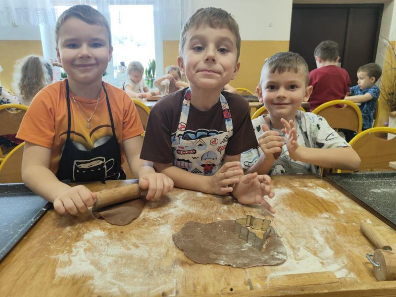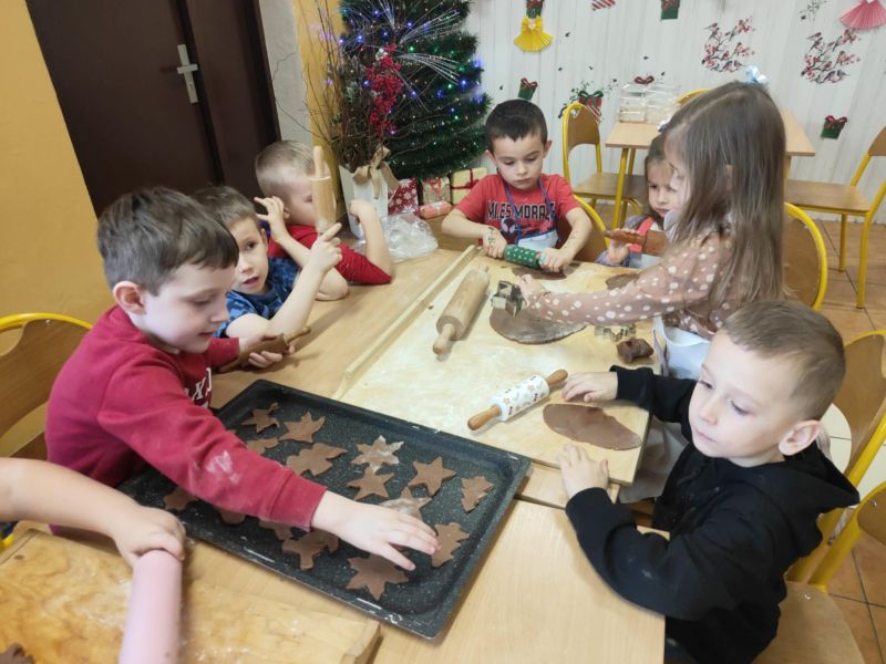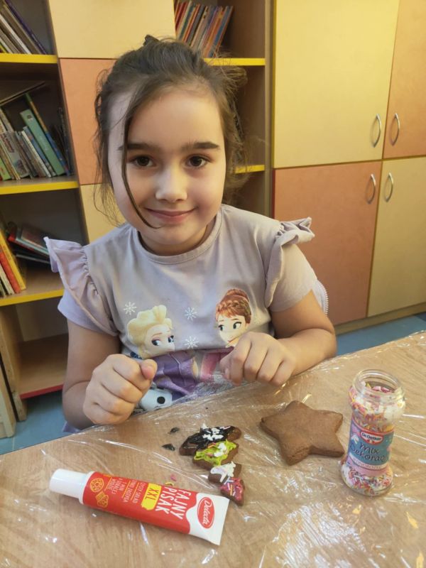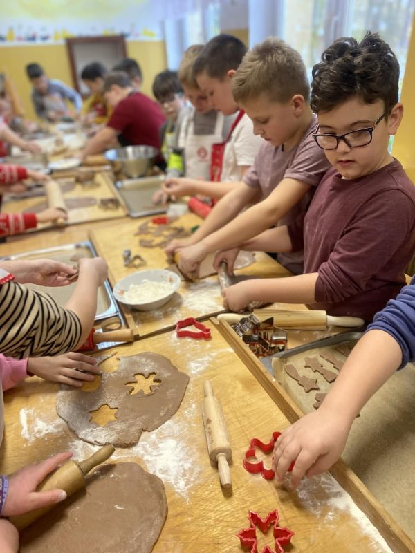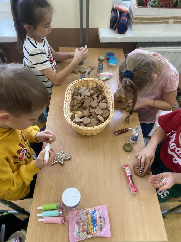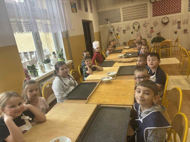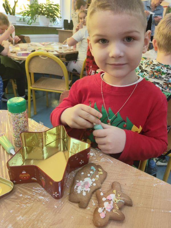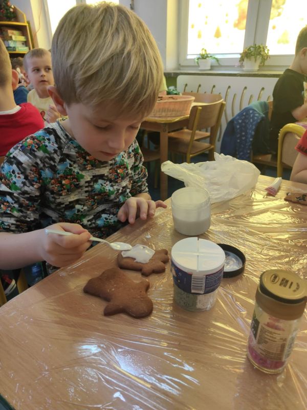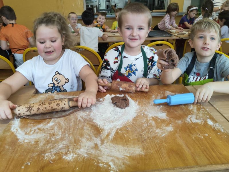 W ostatnim, przedświątecznym tygodniu grudnia przedszkolaki oraz uczniowie klasy 1 a i 2 a z pomocą Pań wychowawczyń oraz pracowników kuchni wspólnie upiekły świąteczne pierniczki. Dzieci z radością wałkowały ciasto i wycinały świąteczne kształty, ucząc się przy tym współpracy i samodzielności. W dniu następnym odbyło się dekorowanie pierniczków - kolorowe lukry, posypki i mnóstwo pomysłów sprawiły, że każde ciasteczko było wyjątkowe. Zajęcia dostarczyły dzieciom wiele radości i wprowadziły je w świąteczny nastrój.