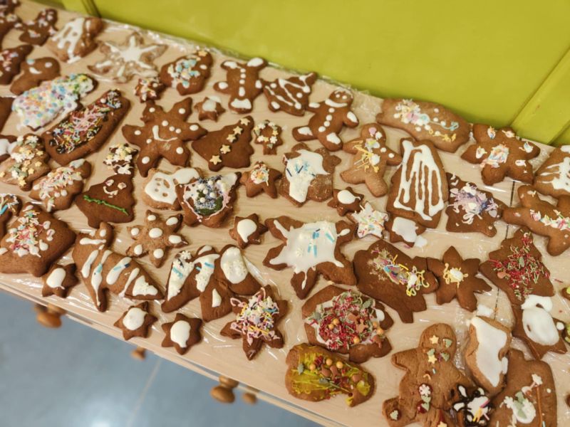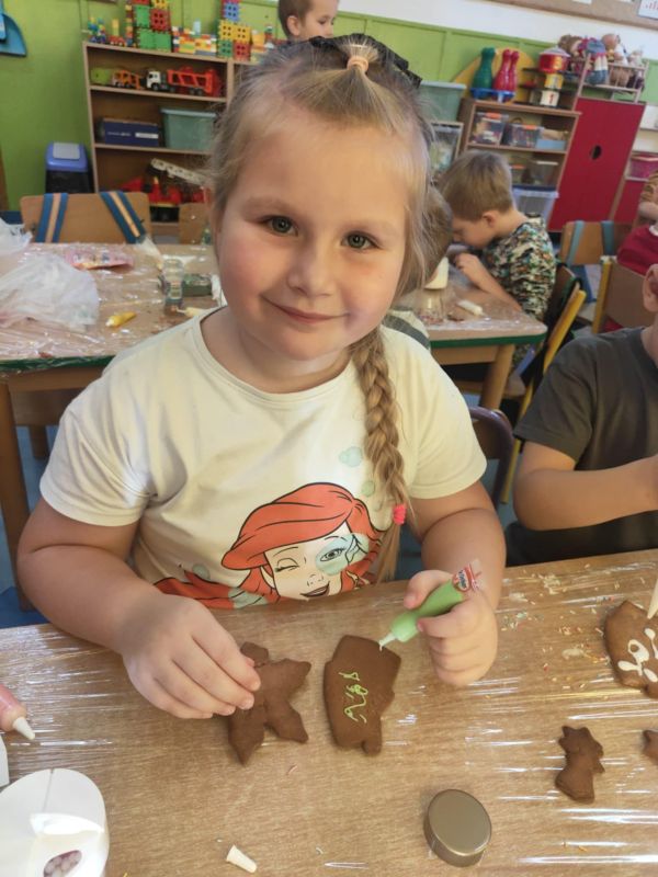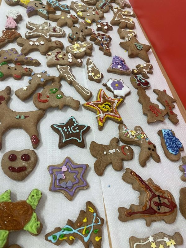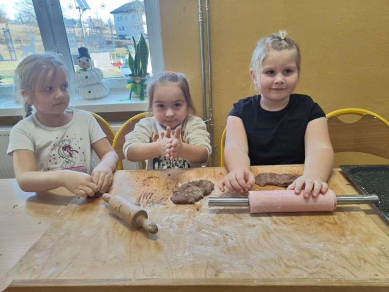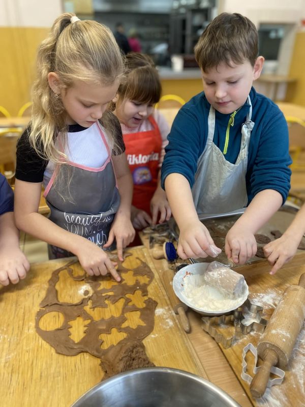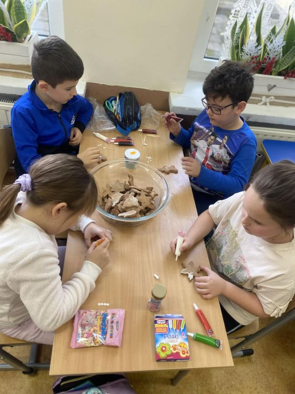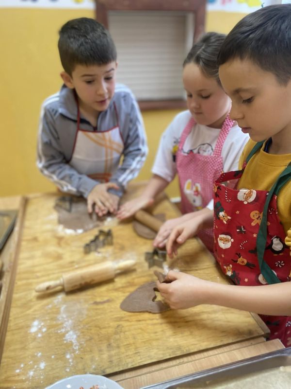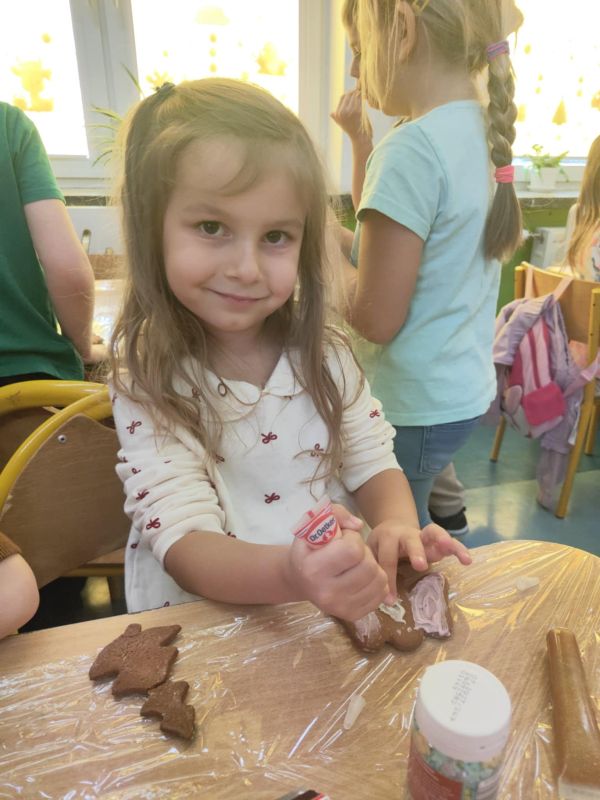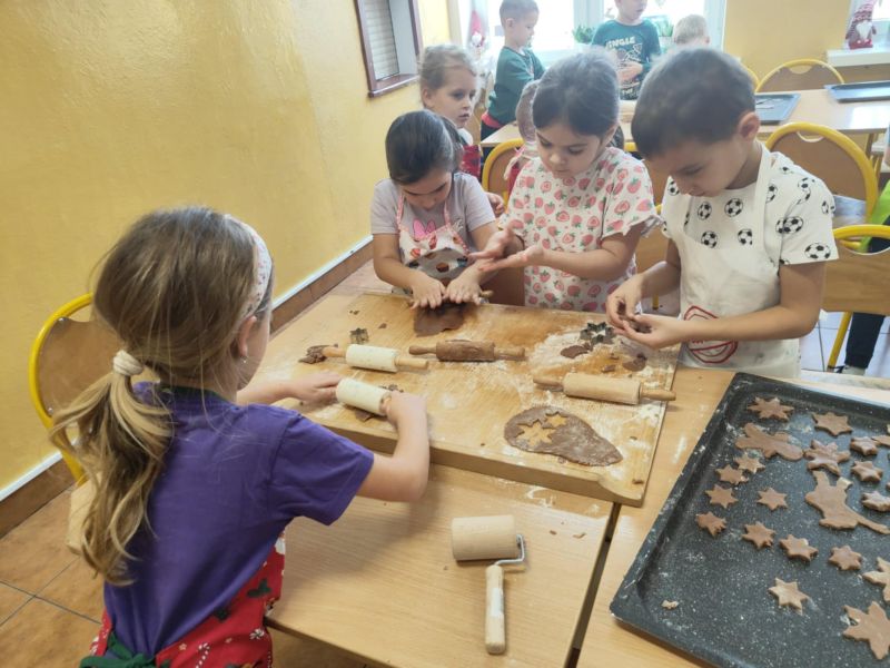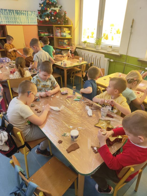 W ostatnim, przedświątecznym tygodniu grudnia przedszkolaki oraz uczniowie klasy 1 a i 2 a z pomocą Pań wychowawczyń oraz pracowników kuchni wspólnie upiekły świąteczne pierniczki. Dzieci z radością wałkowały ciasto i wycinały świąteczne kształty, ucząc się przy tym współpracy i samodzielności. W dniu następnym odbyło się dekorowanie pierniczków - kolorowe lukry, posypki i mnóstwo pomysłów sprawiły, że każde ciasteczko było wyjątkowe. Zajęcia dostarczyły dzieciom wiele radości i wprowadziły je w świąteczny nastrój.