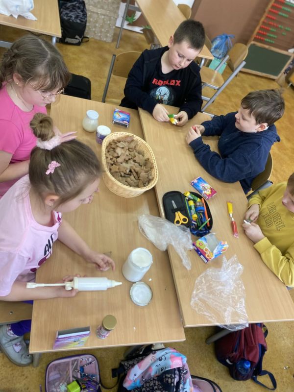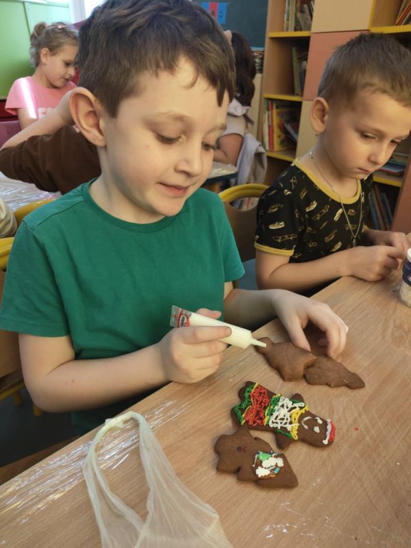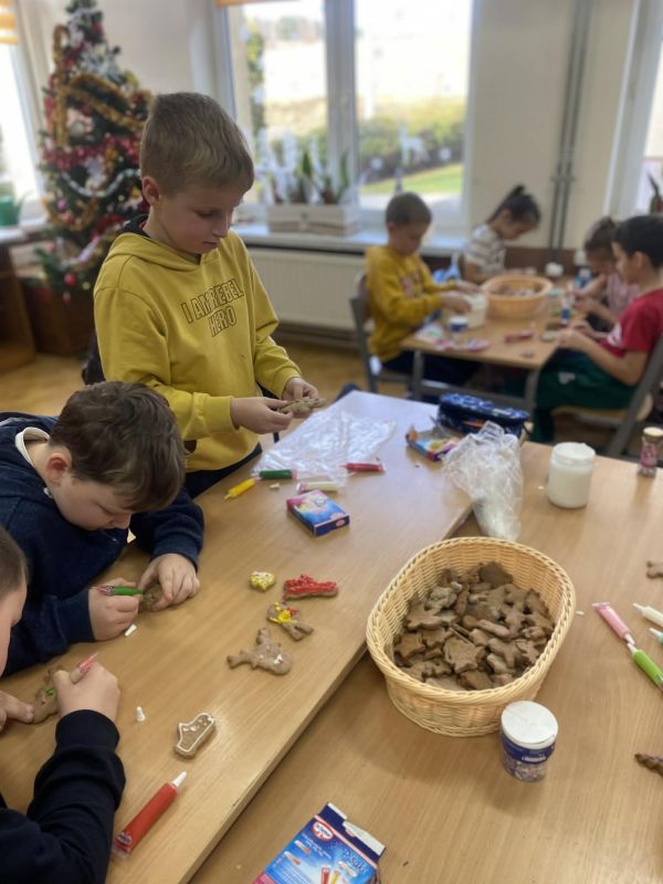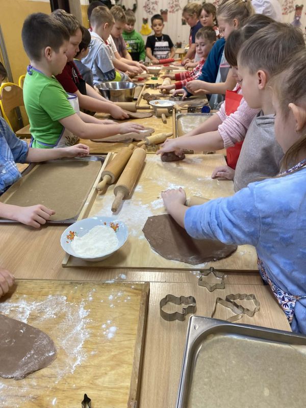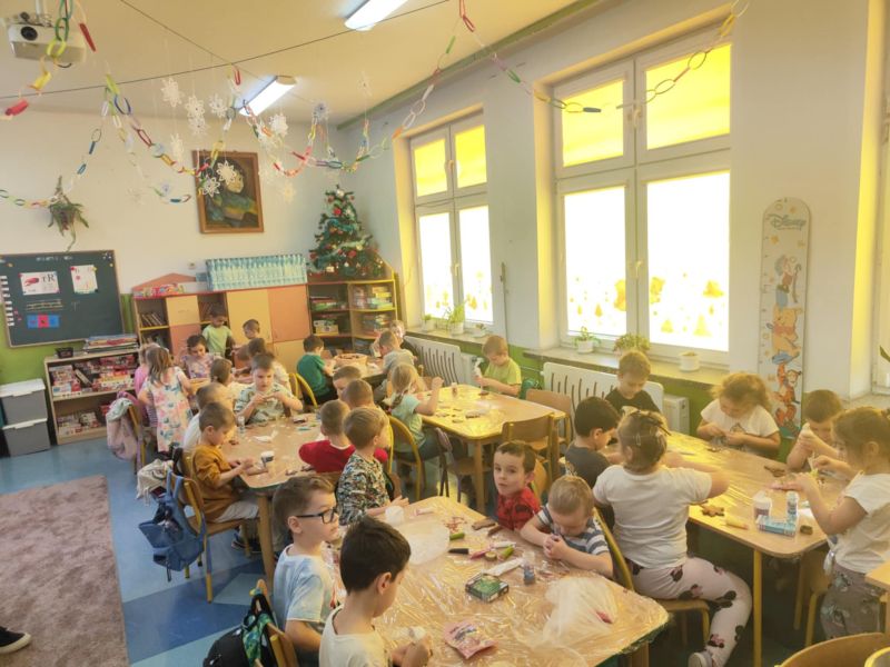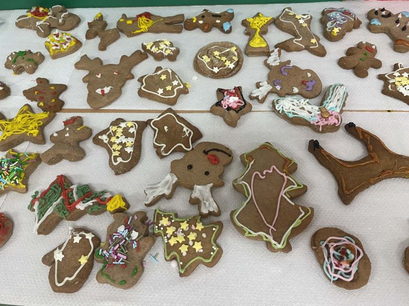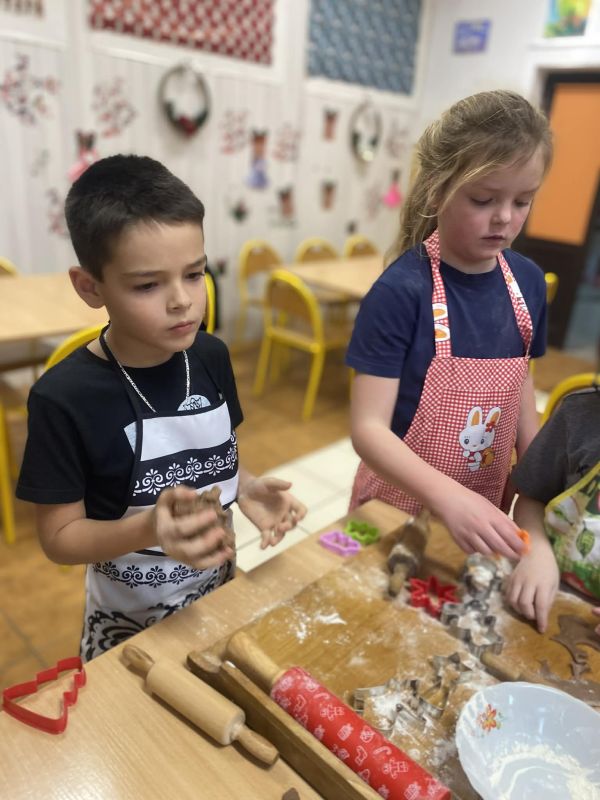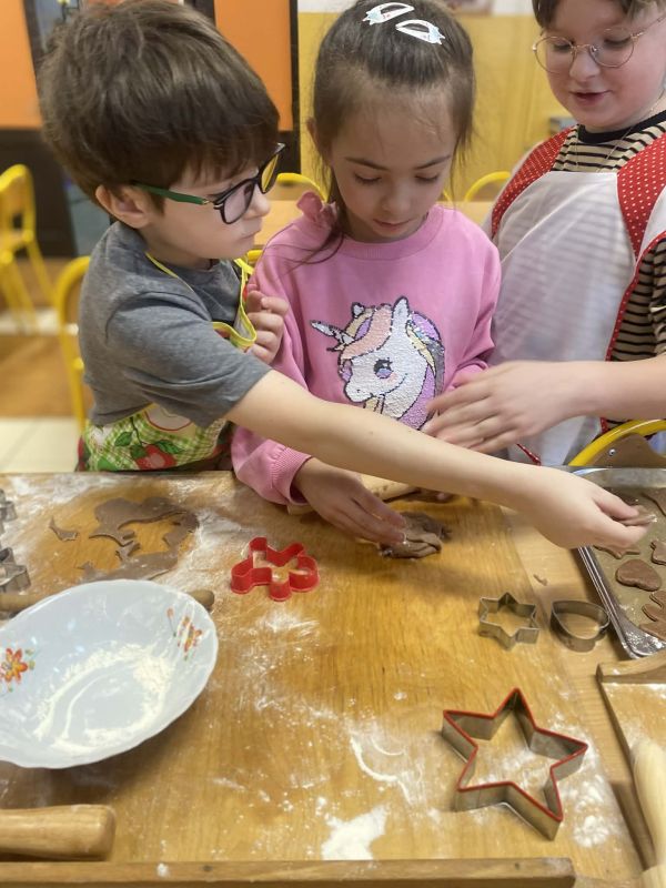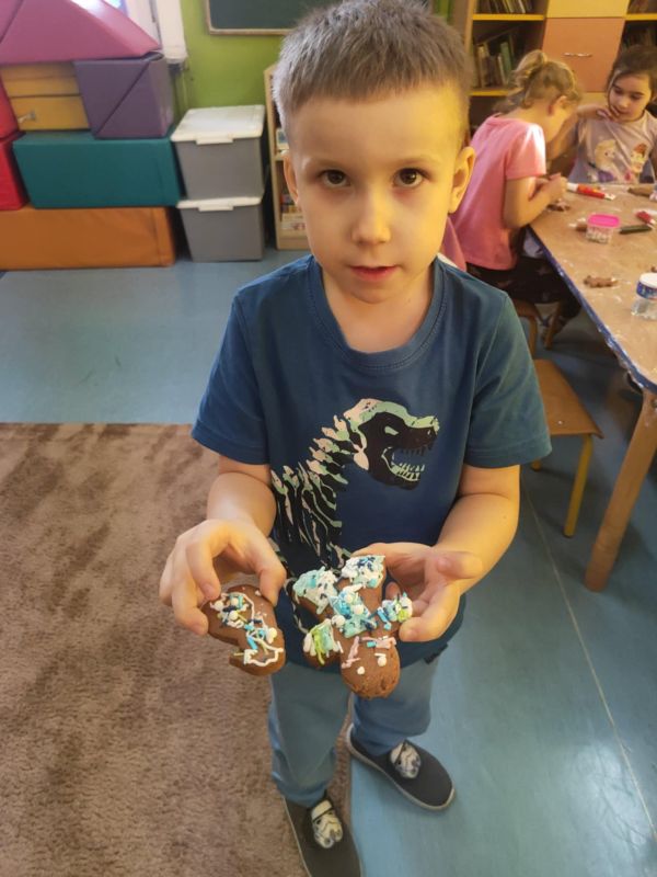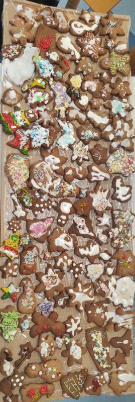 W ostatnim, przedświątecznym tygodniu grudnia przedszkolaki oraz uczniowie klasy 1 a i 2 a z pomocą Pań wychowawczyń oraz pracowników kuchni wspólnie upiekły świąteczne pierniczki. Dzieci z radością wałkowały ciasto i wycinały świąteczne kształty, ucząc się przy tym współpracy i samodzielności. W dniu następnym odbyło się dekorowanie pierniczków - kolorowe lukry, posypki i mnóstwo pomysłów sprawiły, że każde ciasteczko było wyjątkowe. Zajęcia dostarczyły dzieciom wiele radości i wprowadziły je w świąteczny nastrój.