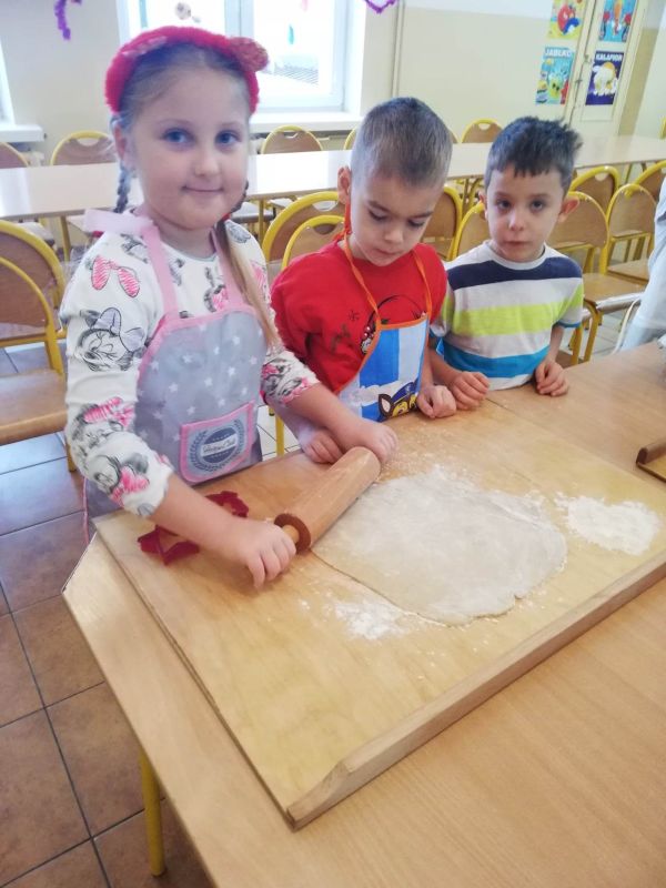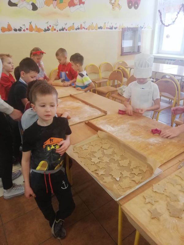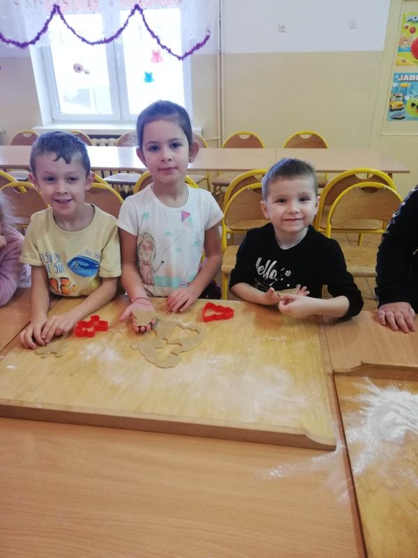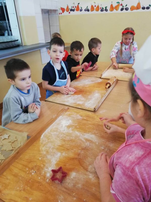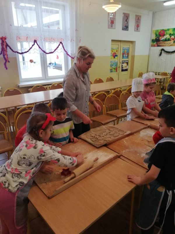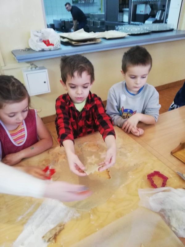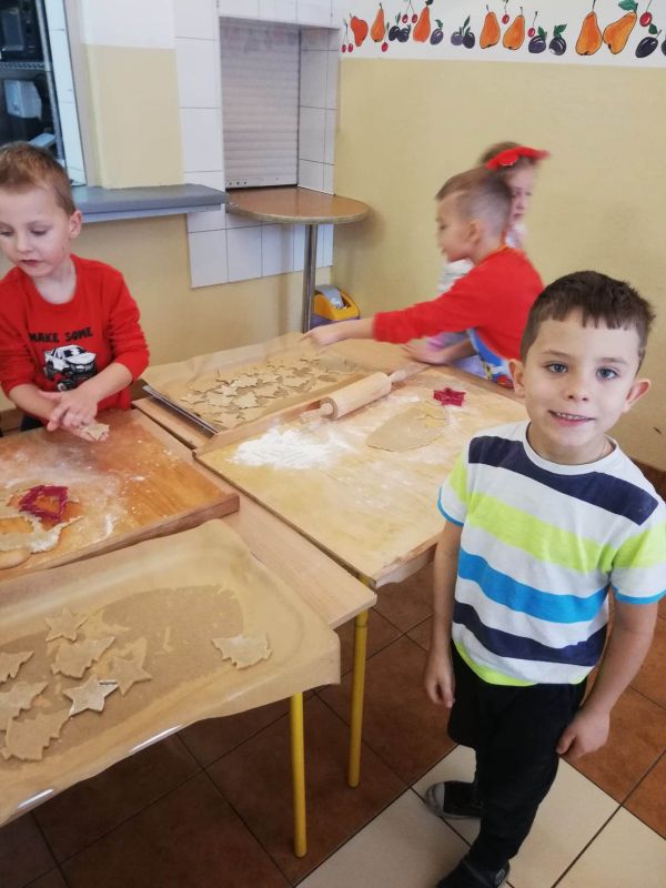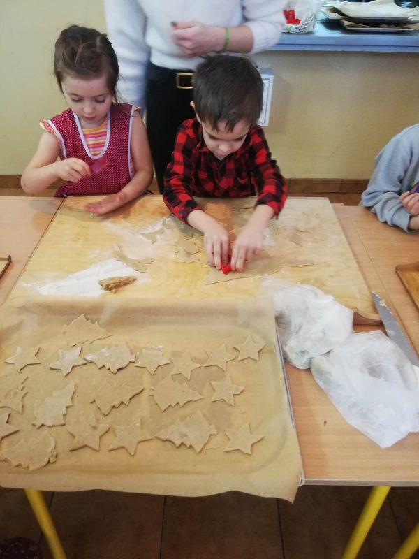 Święta tuż, tuż.... czas więc na pieczenie pierników. 16 grudnia 2022 roku w szkole unosił się zapach korzennych przypraw, a wszystko dlatego, że przedszkolaki tego dnia piekły świąteczne pierniczki. Dzieci z ogromnym zapałem i zaangażowaniem wałkowały ciasto, wykrawały ciasteczka, a po ich upieczeniu z wielką radością dekorowały je kolorowym lukrem i barwnymi posypkami. Mali kucharze poczęstowali swoimi wypiekami dyrekcję oraz pracowników szkoły, otrzymując liczne pochwały. Szefami kuchni były Panie: Lucyna Rusztowicz i Monika Liszka, które pokazały dzieciom jak od kuchennej receptury dojść do gotowego produktu. Teraz przedszkolaki mogą swoje umiejętności zaprezentować rodzicom i wykonać pierniczki w domu.