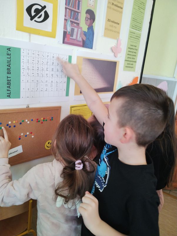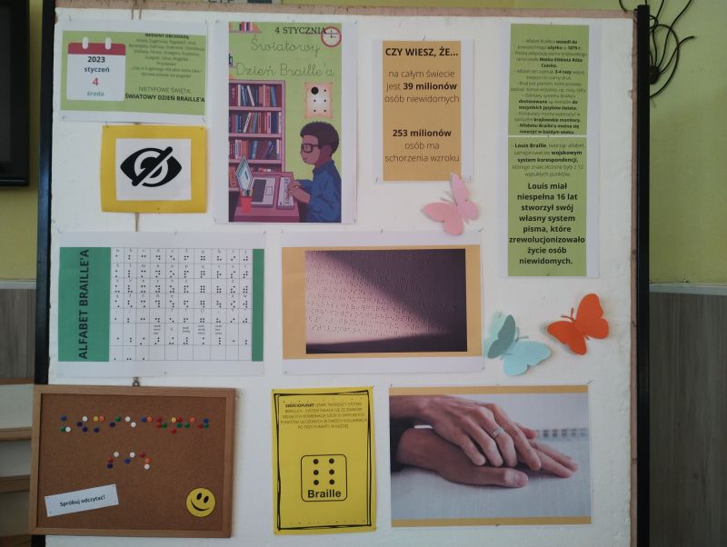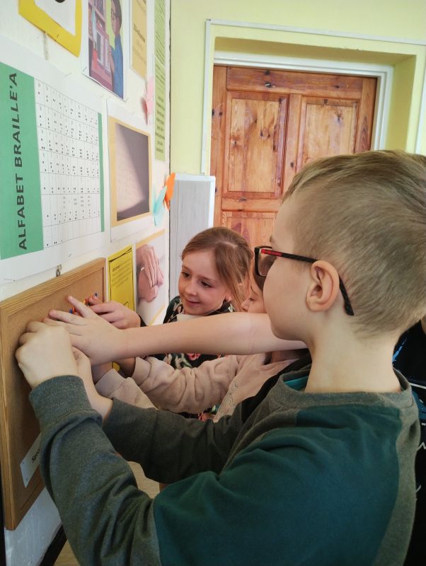 W ramach realizacji projektu “Każdy inny - wszyscy równi” uczniowie świetlicy wzięli udział w zajęciach z okazji Światowego Dnia Braille’a, który obchodzony jest 4 stycznia. Uczniowie zapoznali się z biografią Louisa Braille’a, który już jako 16 letni chłopiec stworzył swój własny system pisma, który zrewolucjonizował życie osób niewidomych. Nasi śmiałkowie mieli możliwość rozszyfrowania hasła zapisanego alfabetem Braille’a. Dzieci bardzo chętnie brały udział w zajęciach i zadawały dużo pytań dotyczących omawianego tematu. Uczniowie naszej szkoły mogą również przez najbliższy czas pogłębić swoją wiedzę w powyższym temacie za pomocą gazetki tematycznej dostępnej na korytarzu szkolnym.