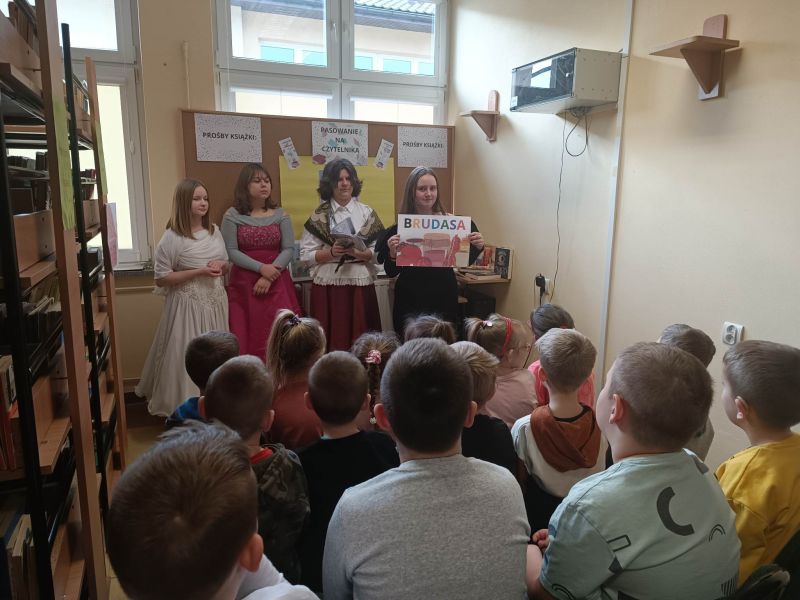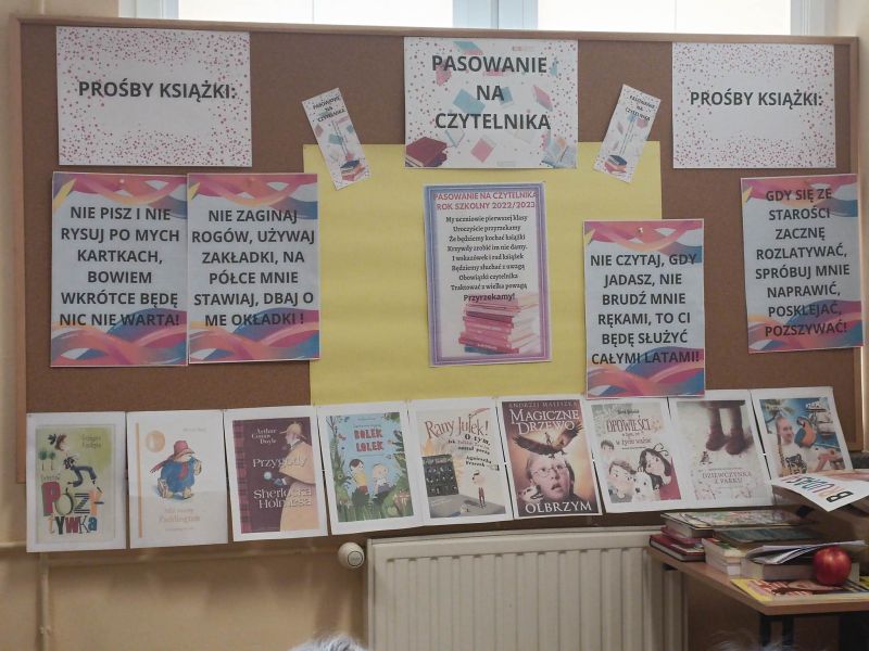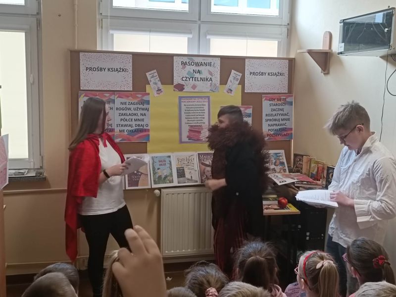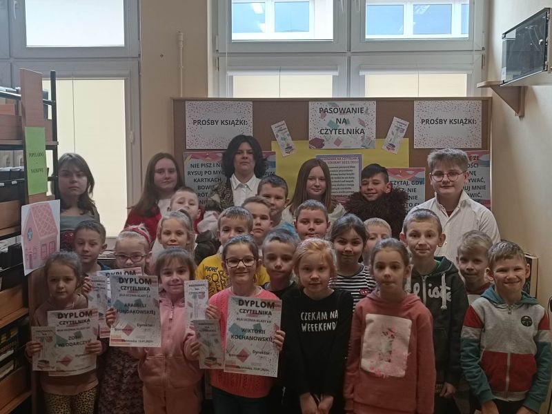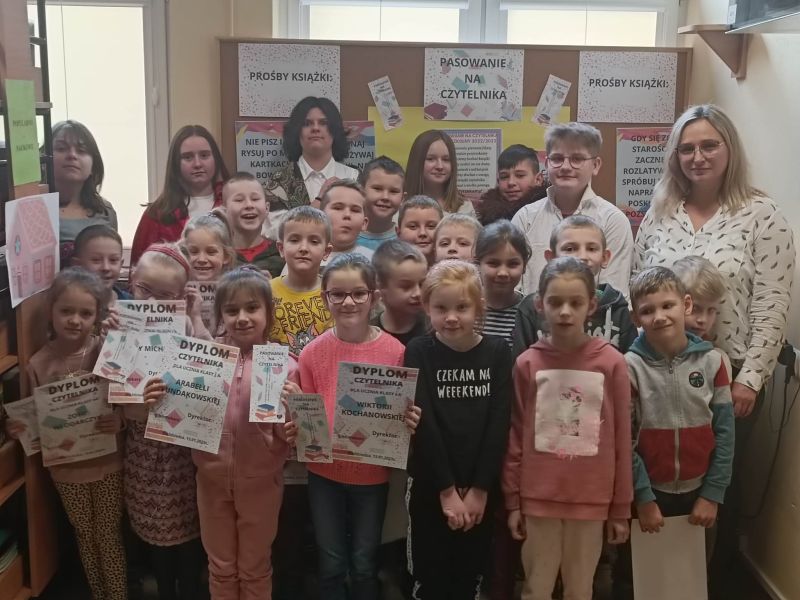 13 stycznia 2023 w szkolnej bibliotece odbyło się pasowanie uczniów klasy pierwszej na czytelników. Starsi koledzy z klasy VII zaprezentowali przyszłym czytelnikom program artystyczny, wcielając się w postacie z różnych bajek. Dzieci złożyły przyrzeczenie i odebrały pamiątkowe dyplomy oraz zakładki do książek. Z okazji tej uroczystości młodzi czytelnicy wykonali piękne prace plastyczne pt. "Moja wymarzona biblioteka". Na zakończenie każdy uczeń mógł wypożyczyć swoją pierwszą książkę. Organizatorem spotkania była Pani Małgorzata Czech.