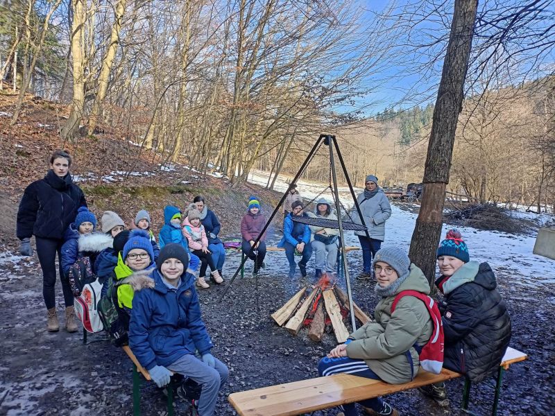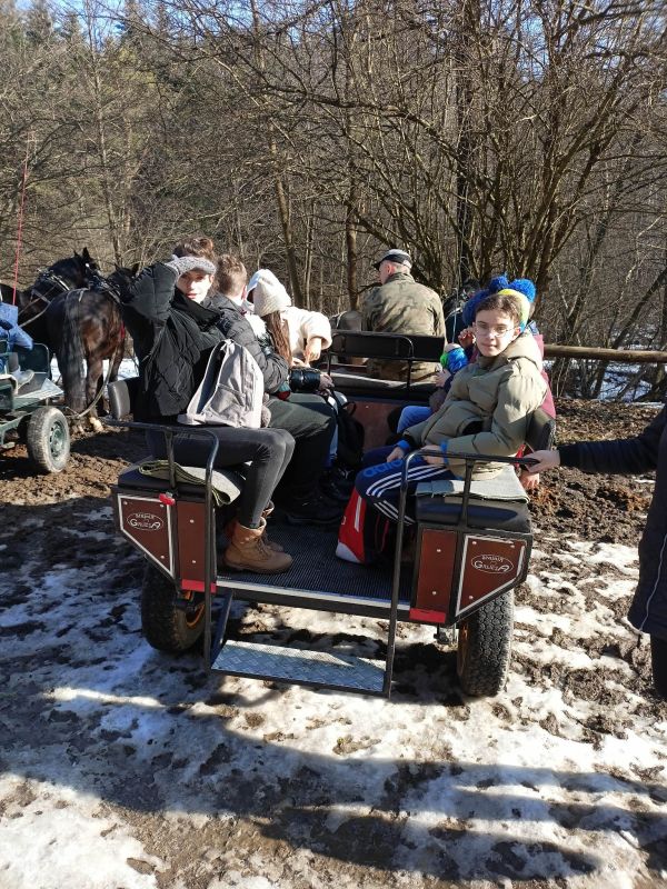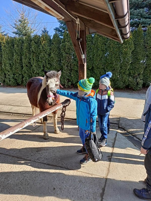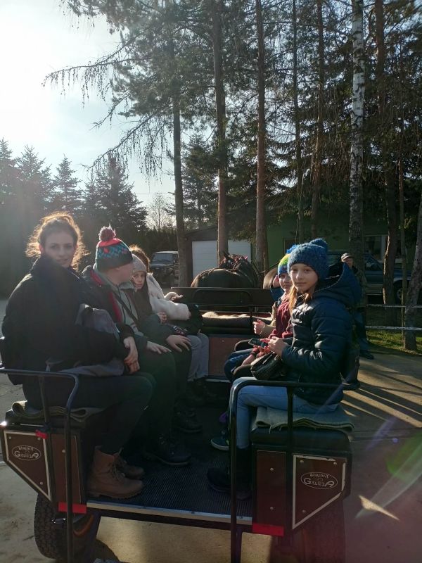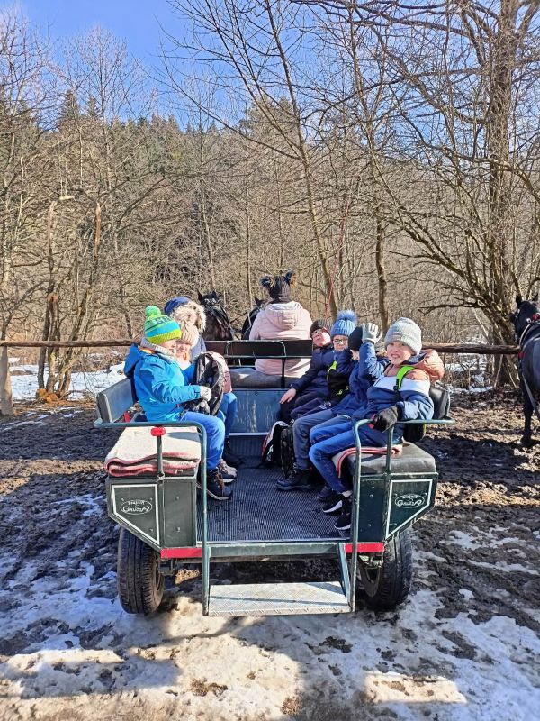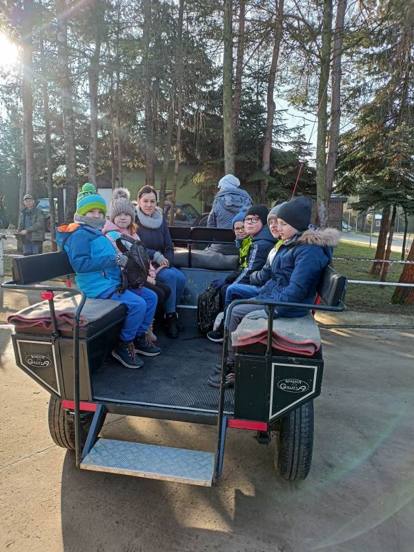 Dnia 16 lutego 2023 r. uczniowie naszej szkoły z klas 0 - 7 odbyli pieszą wycieczkę do ,,Stajni Galicja'' w Bieździedzy. Pierwszym punktem programu była przejażdżka bryczkami do lasu, gdzie na dzieci czekało rozpalone ognisko. Uczniowie piekli kiełbasy oraz zostali poczęstowani ciepłą herbatą. Po powrocie do stadniny każde dziecko odbyło przejażdżkę na koniu, a ostatnim punktem programu było oprowadzenie przez Panią Przewodnik po stajni. Przekazała ona dzieciom kilka ciekawostek na temat koni, jaki i zobrazowała specyfikę pracy z tymi zwierzętami. Dzieci, mimo że troszkę zmęczone, wróciły bardzo zadowolone.