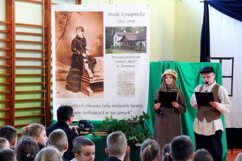 Dla nas, mieszkańców Podkarpacia, ważnym miejscem na mapie literackiej Polski jest Żarnowiec, w którym znajduje się Muzeum Marii Konopnickiej, autorki „Roty”. Nasi uczniowie postanowili przypomnieć twórczość tej wielkiej polskiej poetki, nieco zapomnianą już przez młodsze pokolenie. A przecież to poetka, która walczyła piórem o naszą niepodległość, budząc miłość do Ojczyzny. Dlatego też mieliśmy okazję wysłuchać recytacji jej słynnej „Pieśni o domu”. Przypomnieliśmy także utwory dla dzieci autorki „Stefka Burczymuchy”. Jeden z nich zainscenizował Jonatan Maciejowski - absolwent naszej szkoły, student aktorstwa Krakowskiej Akademii im. Andrzeja Frycza Modrzewskiego, który pierwsze kroki stawiał na szkolnej scenie właśnie w PSP w Bieździedzy, gdzie od 23 lat istnieje kółko teatralne. Najmłodsi aktorzy Teatru Szkolnego „Zielona Kurtyna”: Fabian Borowiecki, Szymon Teleś, Maksymilian Gruchacz, Zuzanna Podgórska, Maria Biernacka i (gościnnie) Grzegorz Hendzel oraz Radosław Sambora zaprezentowali krótką inscenizację noweli Konopnickiej pt. „Mendel Gdański” zawierającą przesłanie o tolerancji i poszanowaniu drugiego człowieka.