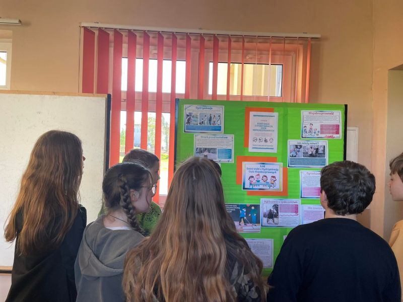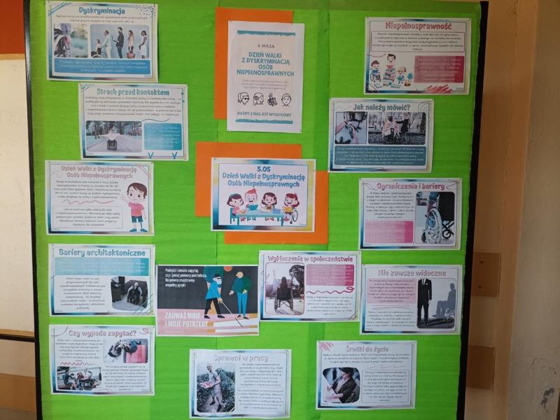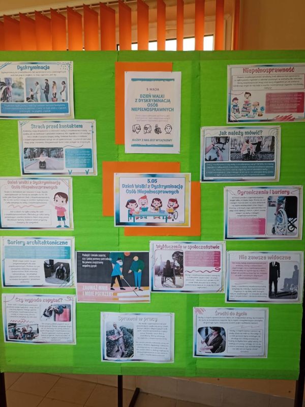 Corocznie 5 maja obchodzony jest w Europie Dzień Walki z Dyskryminacją Osób Niepełnosprawnych. To wyjątkowa okazja, aby pokazać, że każdy z nas ma równe prawa do aktywnego udziału w życiu społecznym. Niezwykle istotne jest kształtowanie pozytywnej, życzliwej i pełnej zrozumienia postawy wobec osób z niepełnosprawnością oraz przełamywanie wszelkich barier i lęków. W związku z tym wydarzeniem, w szkole przeprowadzona została akcja informacyjna, której celem było uwrażliwienie uczniów na potrzeby osób z niepełnosprawnościami. Na korytarzu szkolnym pojawiła się gazetka tematyczna związana z obchodzonym świętem. Uczniowie klasy VI b uczestniczyli w warsztatach prowadzonych przez pedagoga i psychologa szkolnego oraz obejrzeli film edukacyjny mający na celu uwrażliwienie na potrzeby osób niepełnosprawnych, jak również zwrócenie uwagi na najczęstsze problemy z jakimi muszą się borykać.