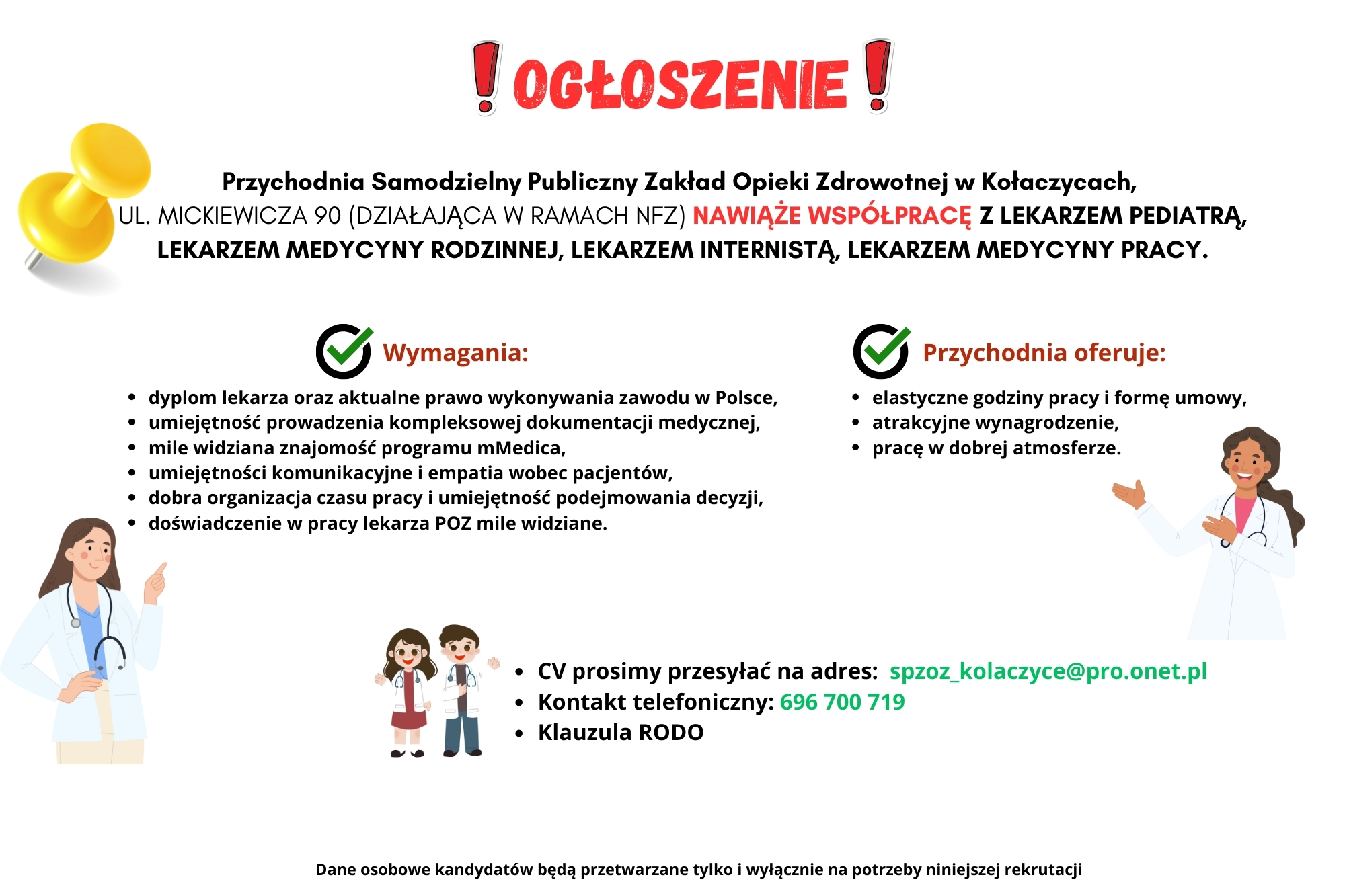 Przychodnia Samodzielny Publiczny Zakład Opieki Zdrowotnej w Kołaczycach, ul. Mickiewicza 90 (działająca w ramach NFZ) nawiąże współpracę z lekarzem pediatrą, lekarzem medycyny rodzinnej, lekarzem internistą, lekarzem medycyny pracy