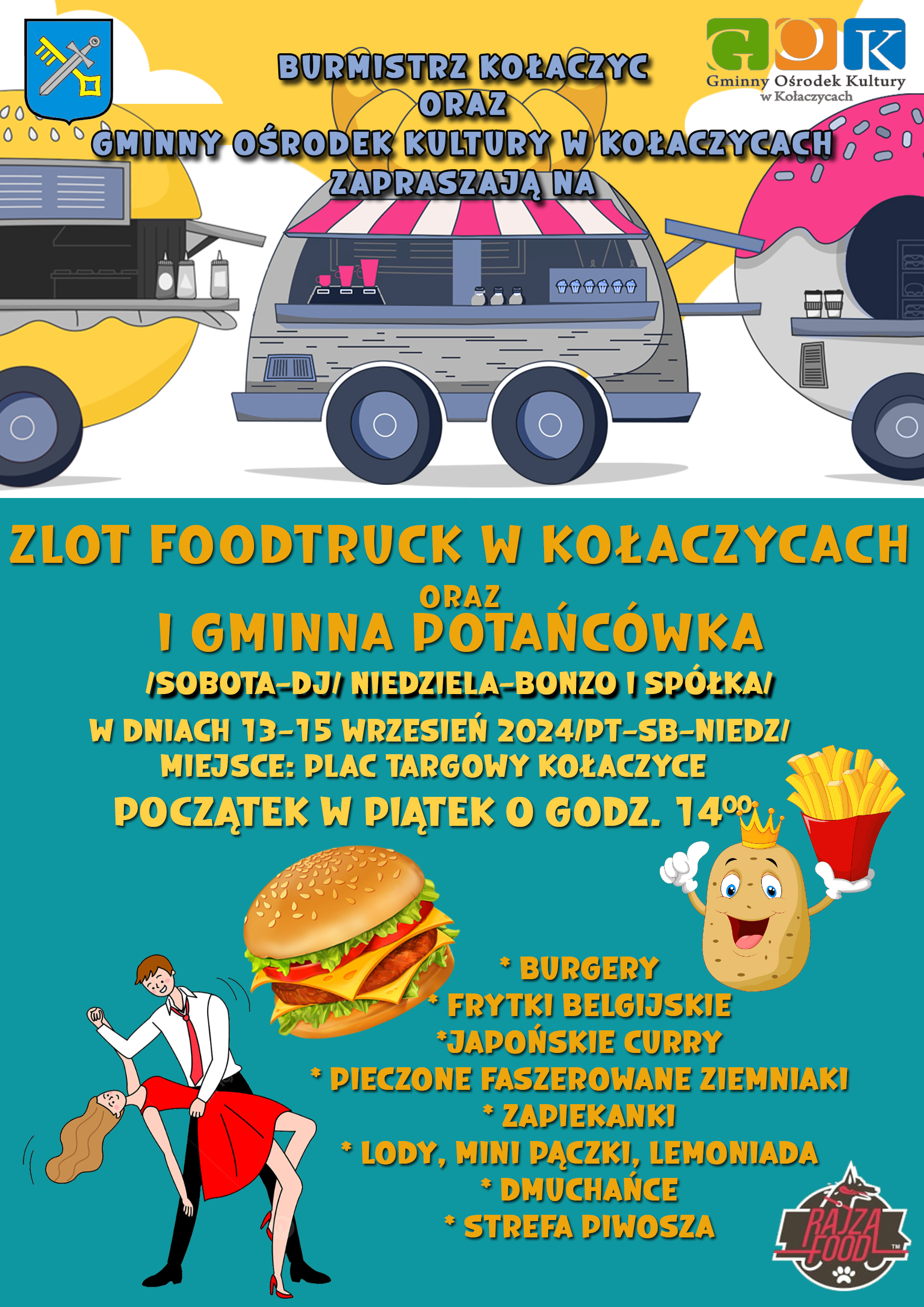 Burmistrz Kołaczyc Magdalena Stasiowska oraz Gminny Ośrodek Kultury w Kołaczycach zapraszają na, „ZLOT FOODTRUCK W KOŁACZYCACH ORAZ I GMINNĄ POTAŃCÓWKĘ”. W dniach 13 – 15 wrzesień 2024r. Miejsce wydarzenia: Plac targowy w Kołaczycach.