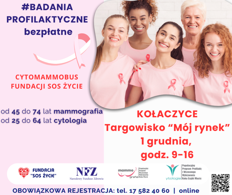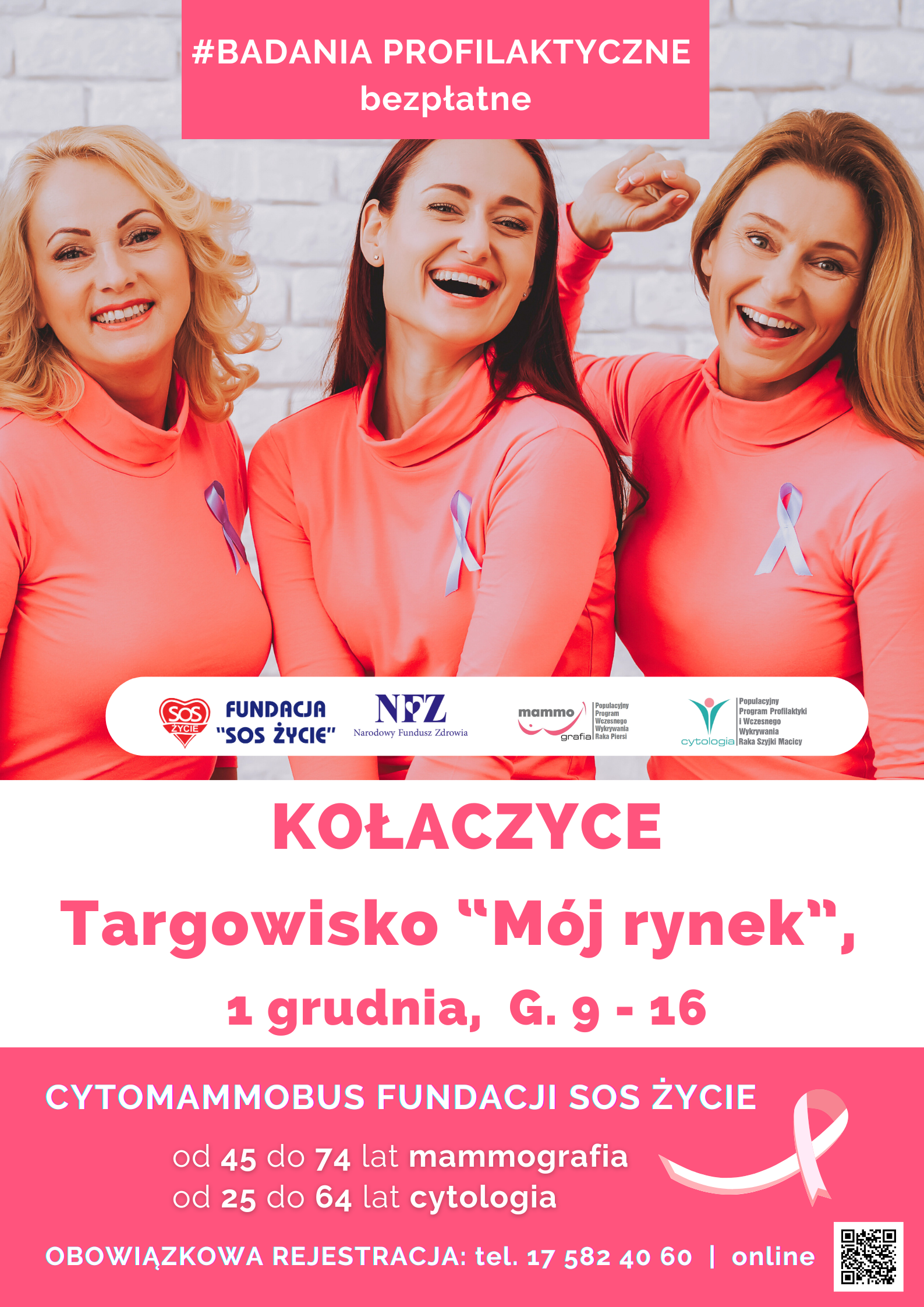 Burmistrz Kołaczyc, Pani Magdalena Stasiowska oraz Fundacja SOS Życie serdecznie zapraszają wszystkie Panie do udziału w badaniach profilaktycznych - mammograficznych i cytologicznych, które odbędą się w Kołaczycach.