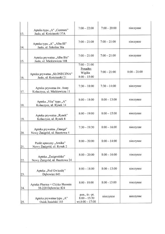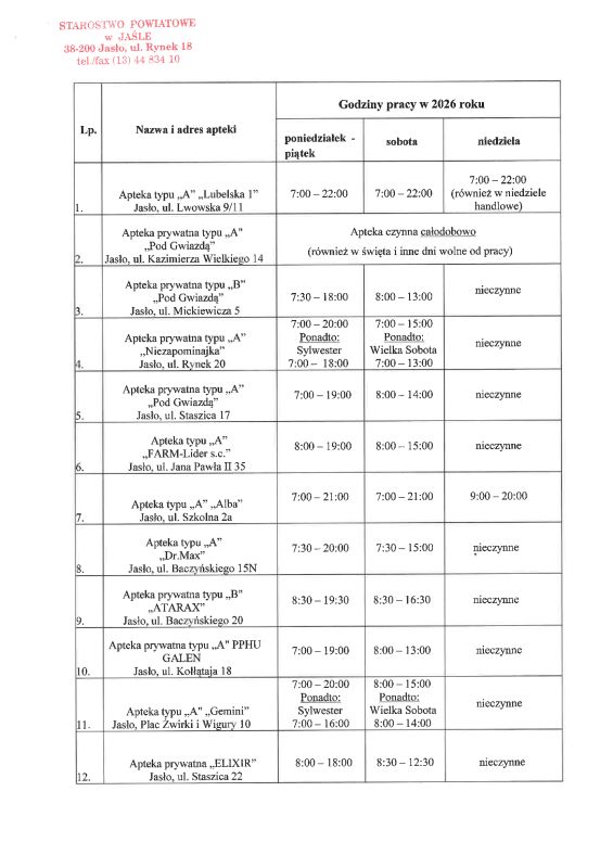 Przedstawiamy rozkład godzin pracy aptek ogólnodostępnych działających na terenie Powiatu Jasielskiego, na 2026 rok.