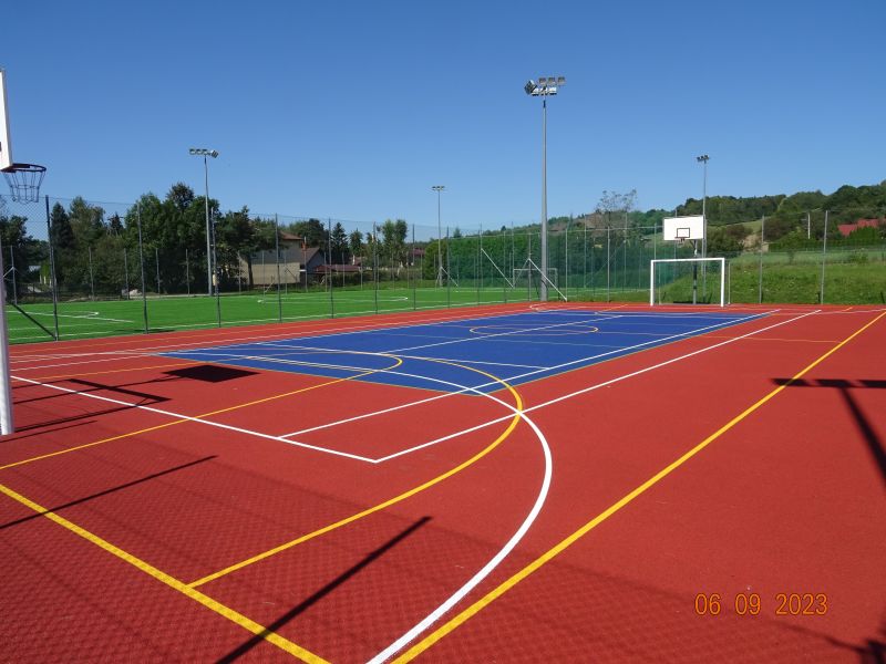 - wykonanie retopingu nawierzchni poliuretanowej (czyszczenie, impregnacja podłoża, wykonanie dwukrotnego natrysku, malowanie linii: boisko do siatkówki, koszykówki, tenisa i piłki ręcznej) - 613,11 m2