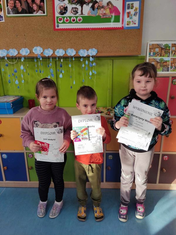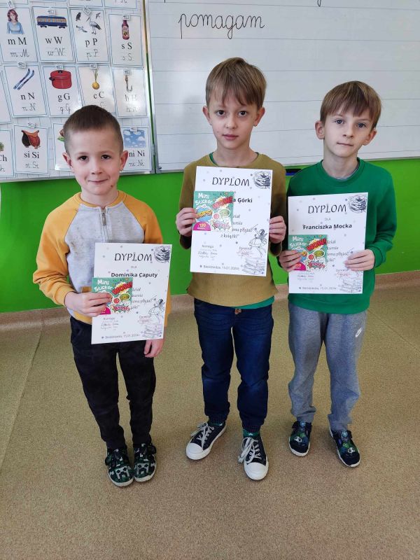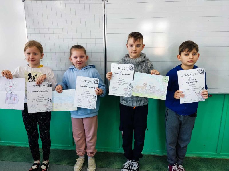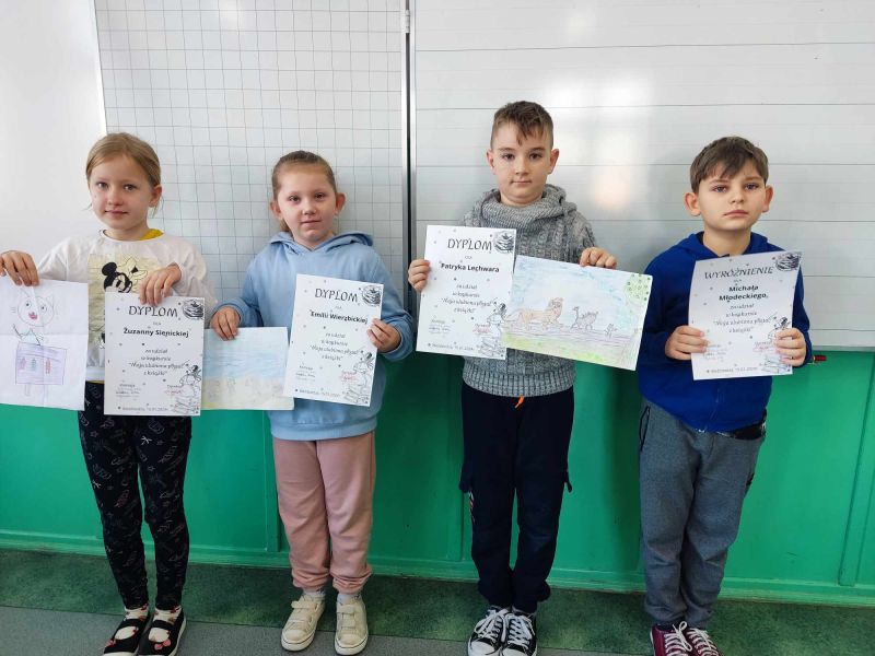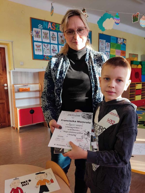 W styczniu 2024 roku został rozstrzygnięty konkurs plastyczny promujący czytelnictwo pn. "Moja ulubiona postać z książki". Komisja konkursowa wybierając zwycięzców wzięła pod uwagę przede wszystkim pomysłowość, estetykę pracy oraz samodzielność wykonania przez uczestnika. Wszyscy uczestnicy dostali dyplomy i drobne upominki. O to lista zwycięzców:Kategoria klas 0:1 miejsce Blanka Gwiżdż,2 miejsce Kinga Pawłowska,3 miejsce Tomasz LeśniakKategoria klasy 2 - 3:1 miejsce Franciszek Mamroł,2 miejsce Łukasz Leśniak,3 miejsce Hanna BiernackaSerdecznie dziękujemy wszystkim uczestnikom za udział w konkursie!