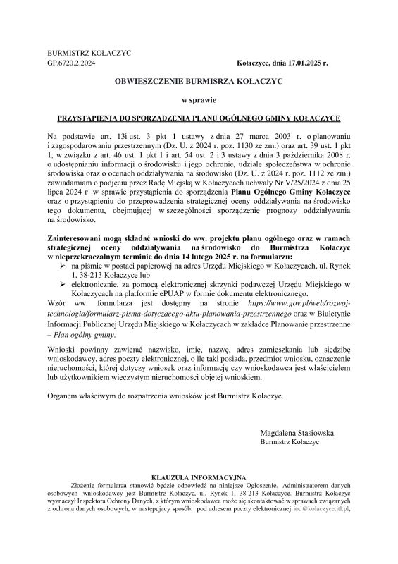 UM OBWIESZCZENIE BURMISTRZA KOŁACZYC W SPRAWIE PRZYSTĄPIENIA DO SPORZĄDZENIA PLANU OGÓLNEGO GMINY KOŁACZYCE