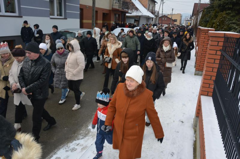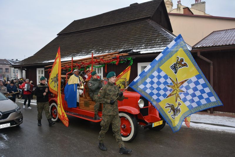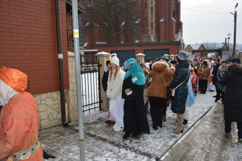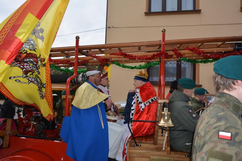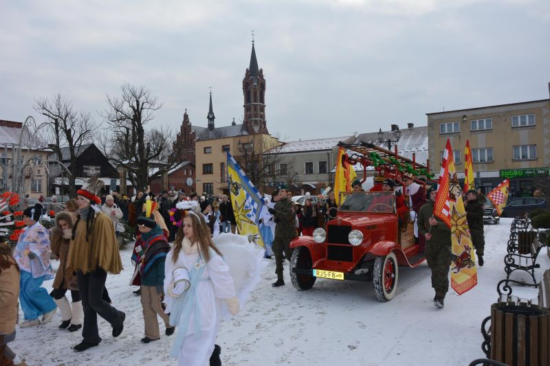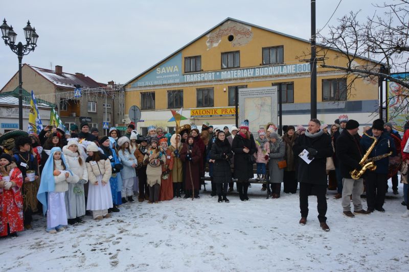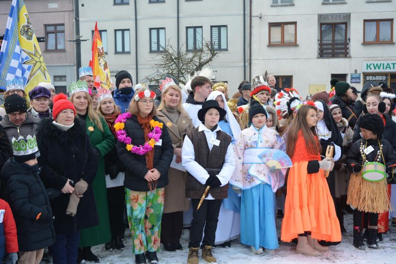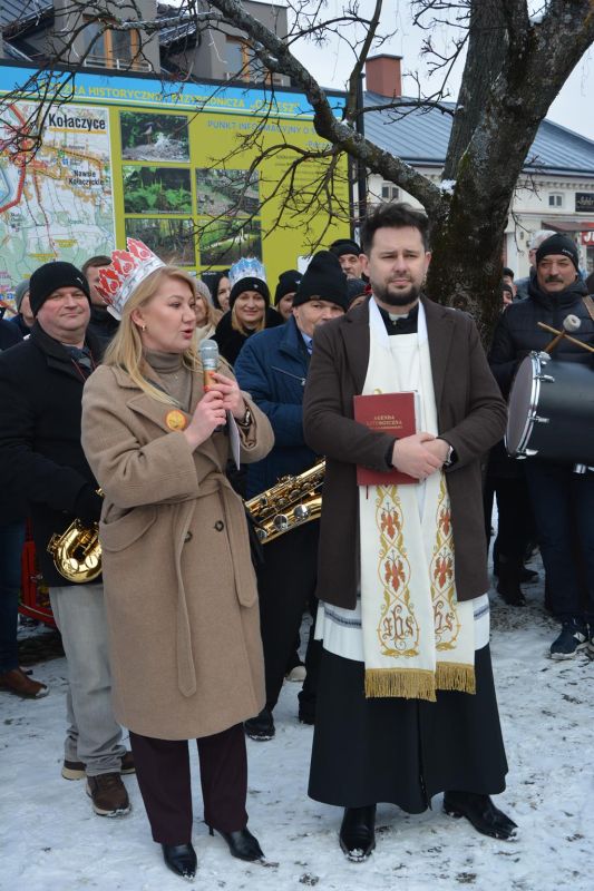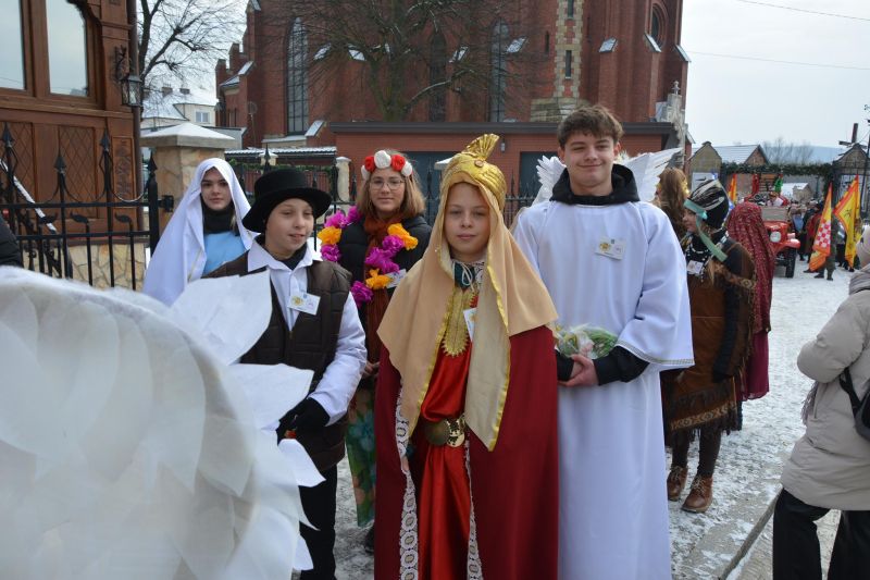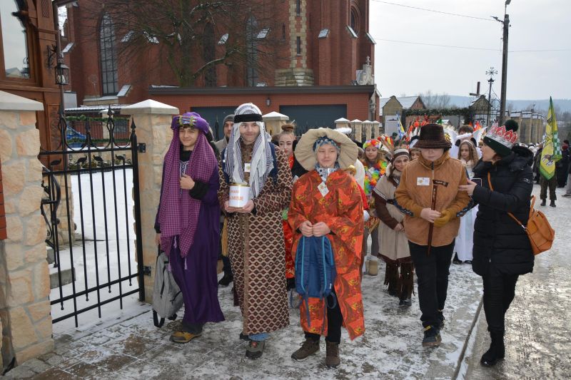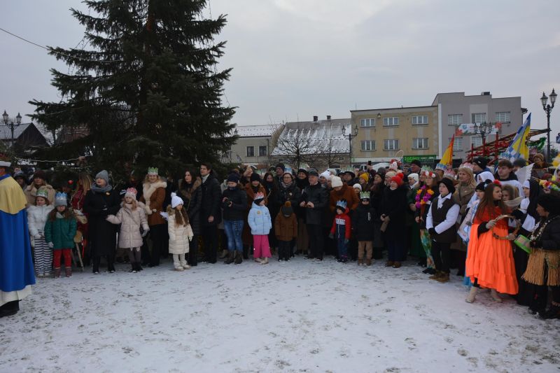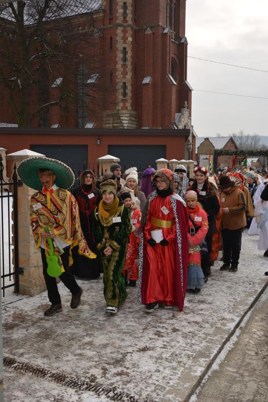 Barwny pochód wyruszył po zakończonej Mszy Świętej. Na jego czele maszerowali strzelcy z LO Kołaczyce, wyznaczając trasę przemarszu. Za nimi podążali Kolędnicy Misyjni, a następnie Trzej Królowie. W tegorocznej edycji w postacie Mędrców wcielili się kapłani z naszej parafii, którzy do miejsca pokłonu przyjechali zabytkowym wozem strażackim. Dalej do orszaku dołączali mieszkańcy, tworząc kolorowy i rozśpiewany pochód. Oprawa muzyczna, prowadzona przez organistę pana Krzysztofa Palara, któremu towarzyszył zespół muzyczny sprawiła, że kolędy rozbrzmiewały w całym mieście.