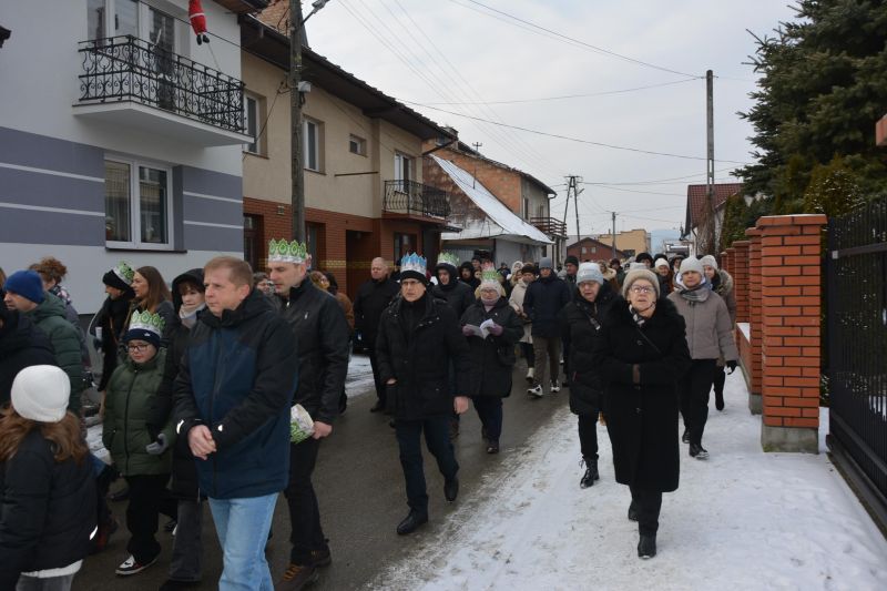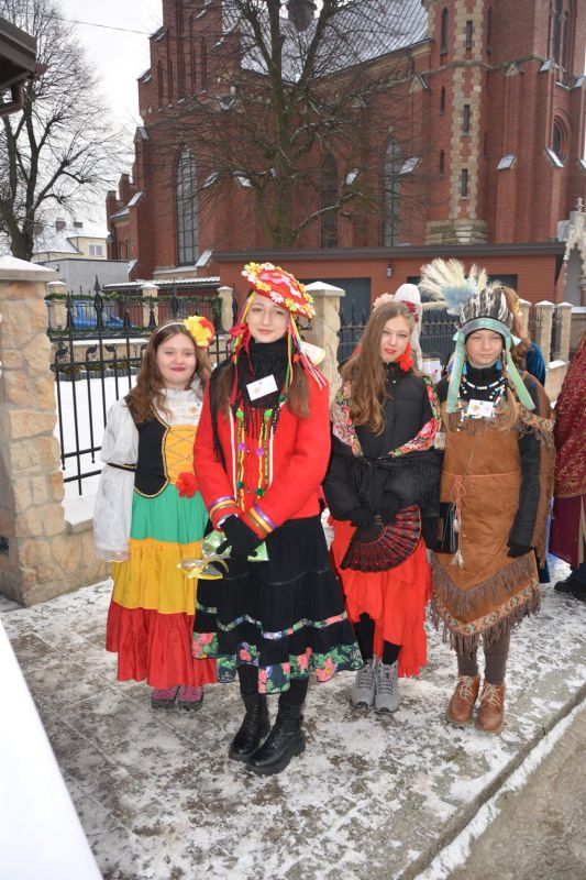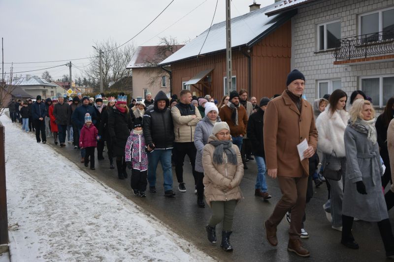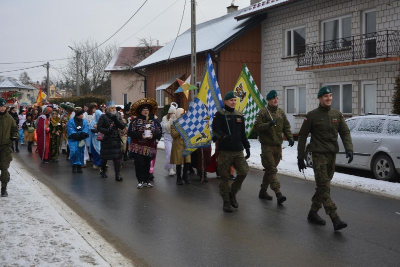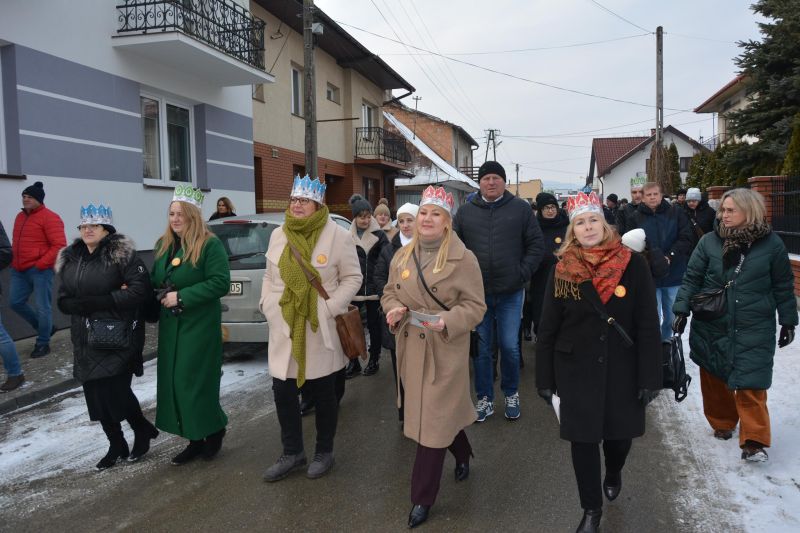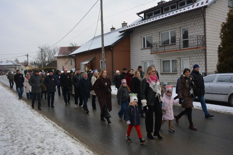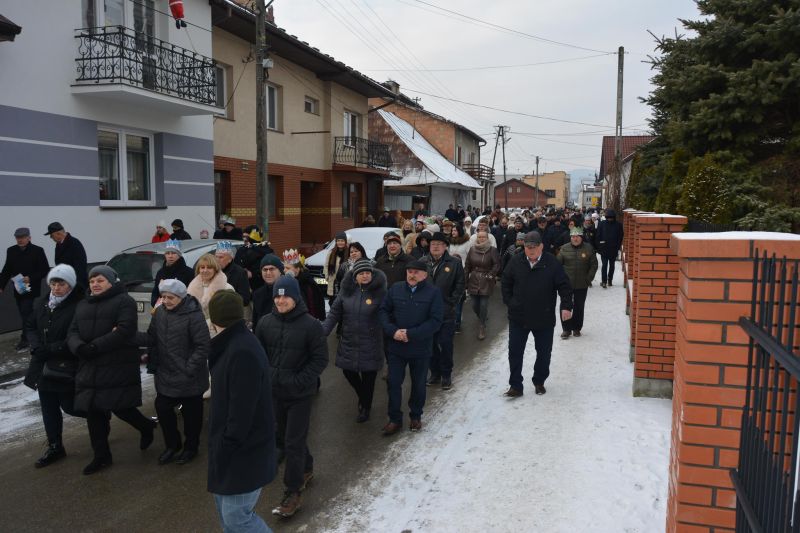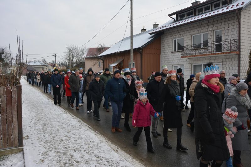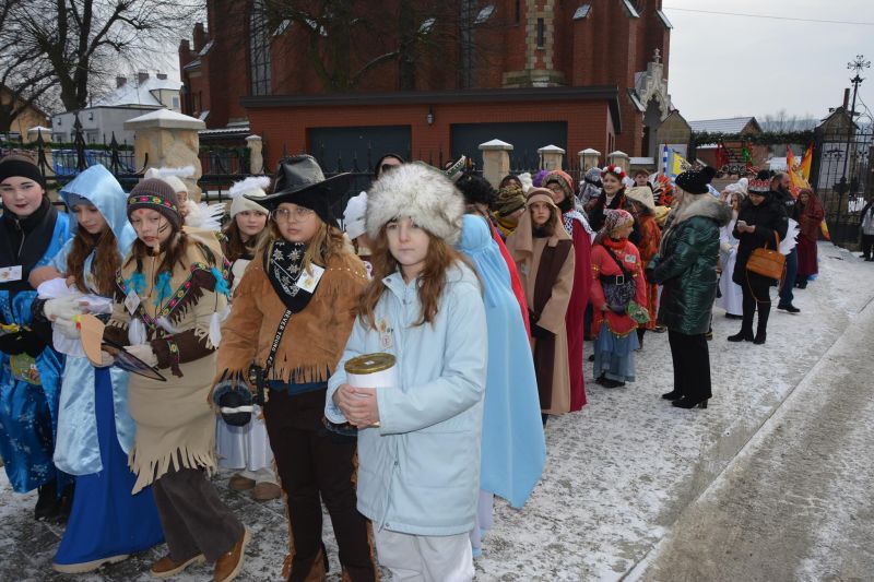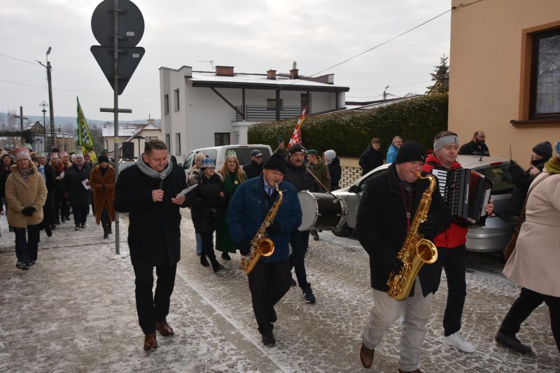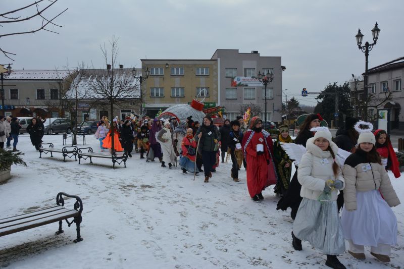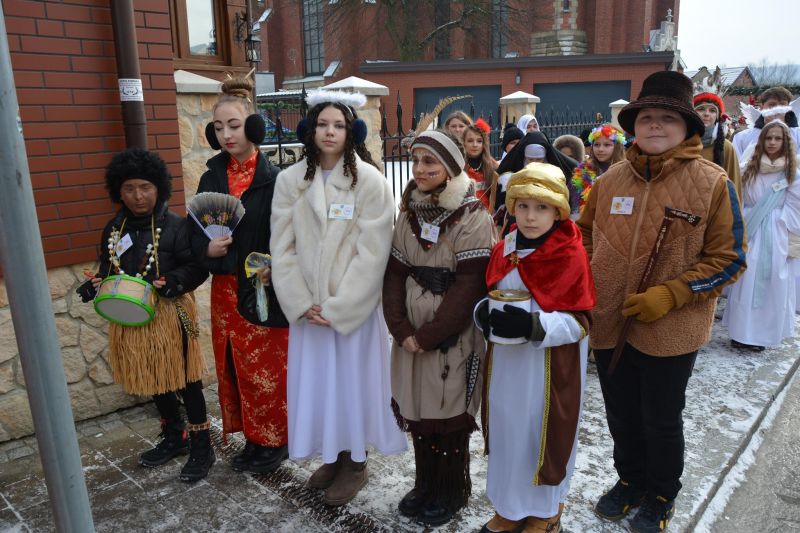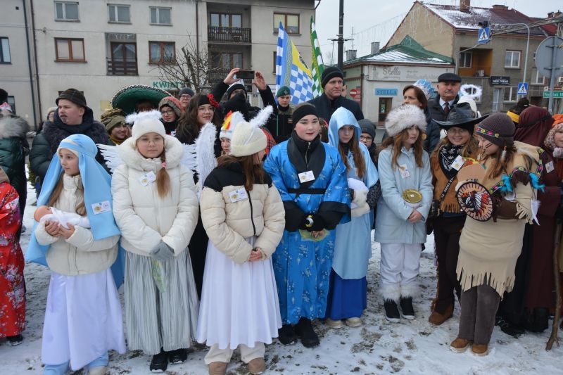 Barwny pochód wyruszył po zakończonej Mszy Świętej. Na jego czele maszerowali strzelcy z LO Kołaczyce, wyznaczając trasę przemarszu. Za nimi podążali Kolędnicy Misyjni, a następnie Trzej Królowie. W tegorocznej edycji w postacie Mędrców wcielili się kapłani z naszej parafii, którzy do miejsca pokłonu przyjechali zabytkowym wozem strażackim. Dalej do orszaku dołączali mieszkańcy, tworząc kolorowy i rozśpiewany pochód. Oprawa muzyczna, prowadzona przez organistę pana Krzysztofa Palara, któremu towarzyszył zespół muzyczny sprawiła, że kolędy rozbrzmiewały w całym mieście.